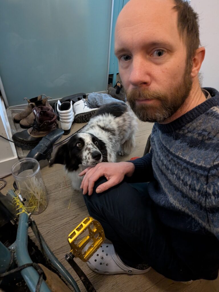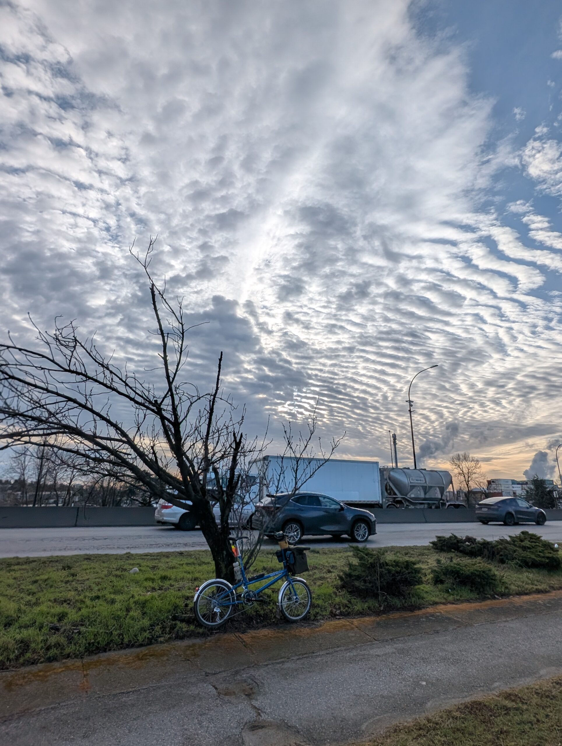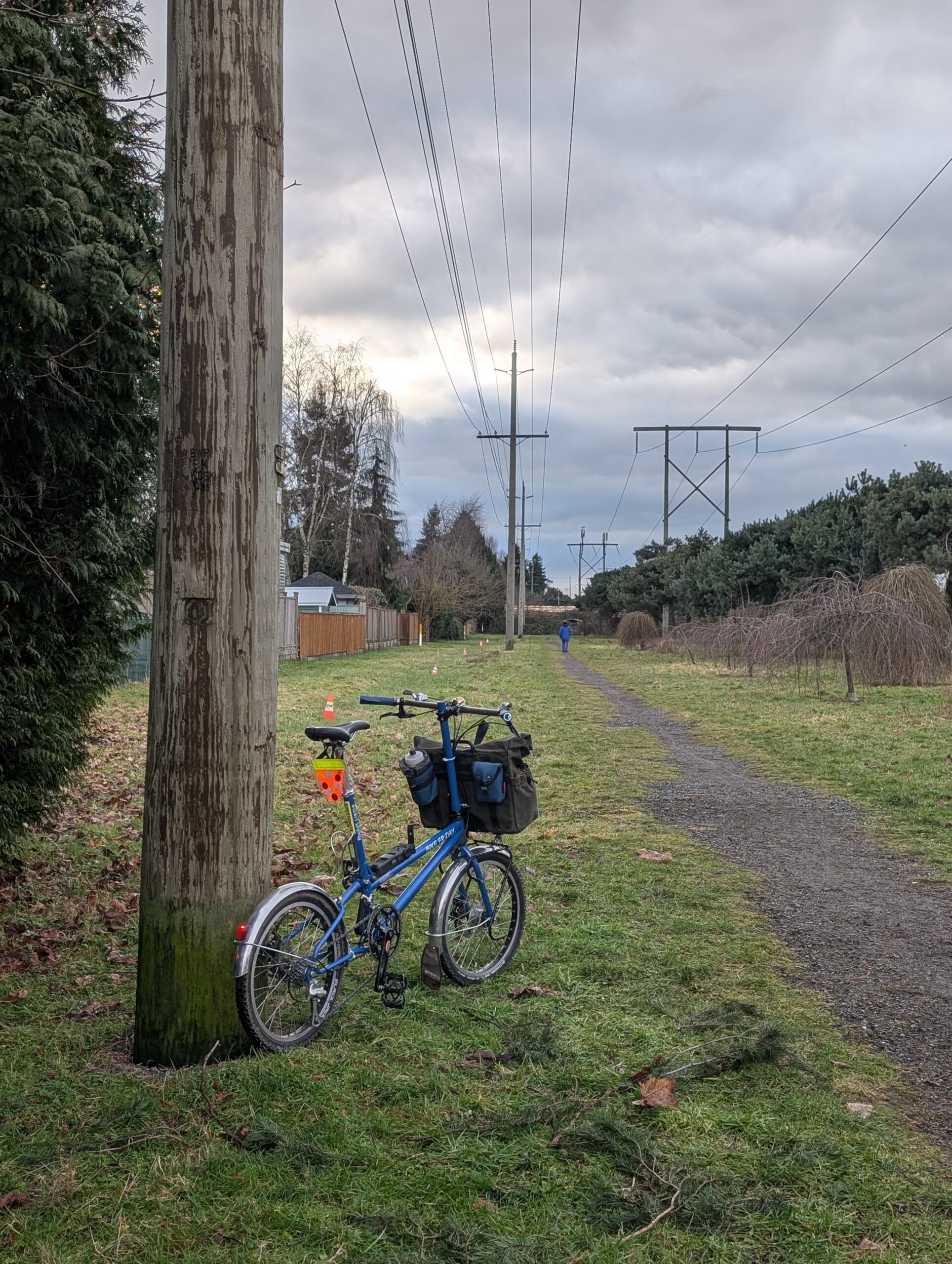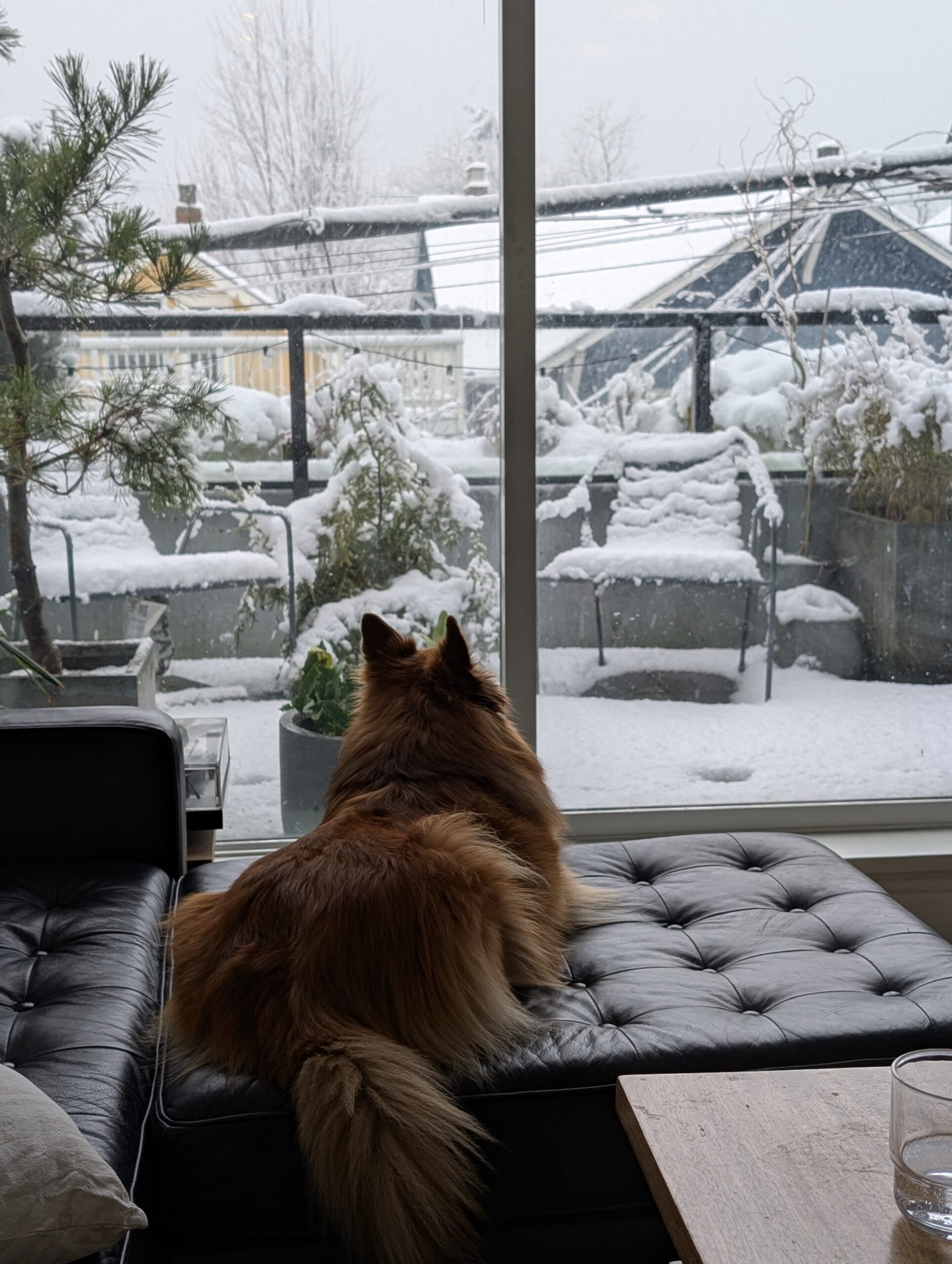 The next morning, Sunday Feb 2nd, we woke up to snow in the city as well. A decent amount of it! We went for a walk with Leia, who loves the snow, and ran into a friend who had some personal stuff and needed someone to take her dog, Archie, for a bit. So he came home with us, and Leia was a bit confused. We kept Archie a few days, over which time it remained consistently well below freezing, so the sidewalks and roads became rather treacherous to walk. I managed one ride over these few days, just a short one to run some errands on the old Raleigh. It is fitted with “all weather” Schwalbe tires that have siping similar to automotive winter tires .. but they aren’t super effective on this rather icy surface.