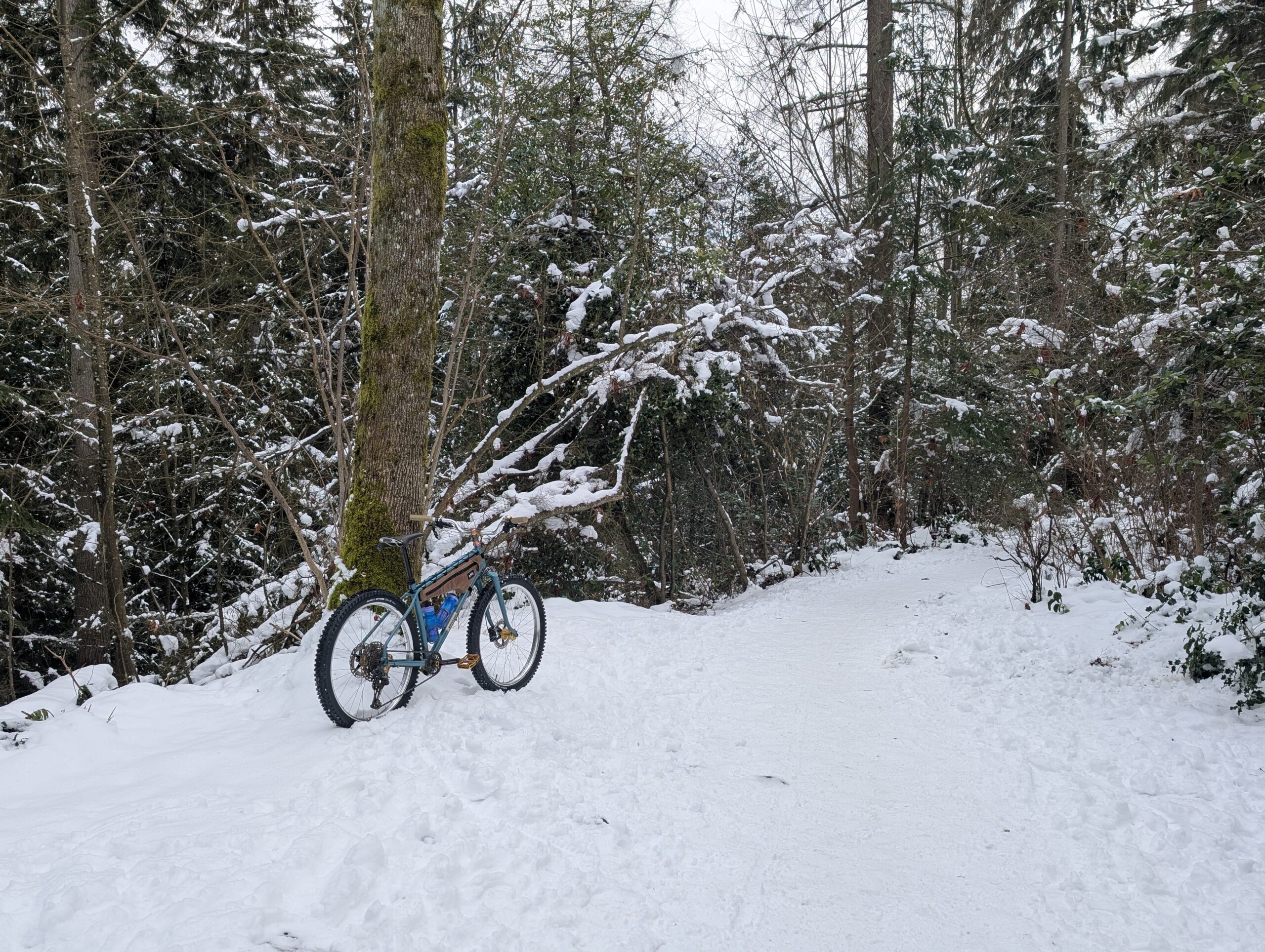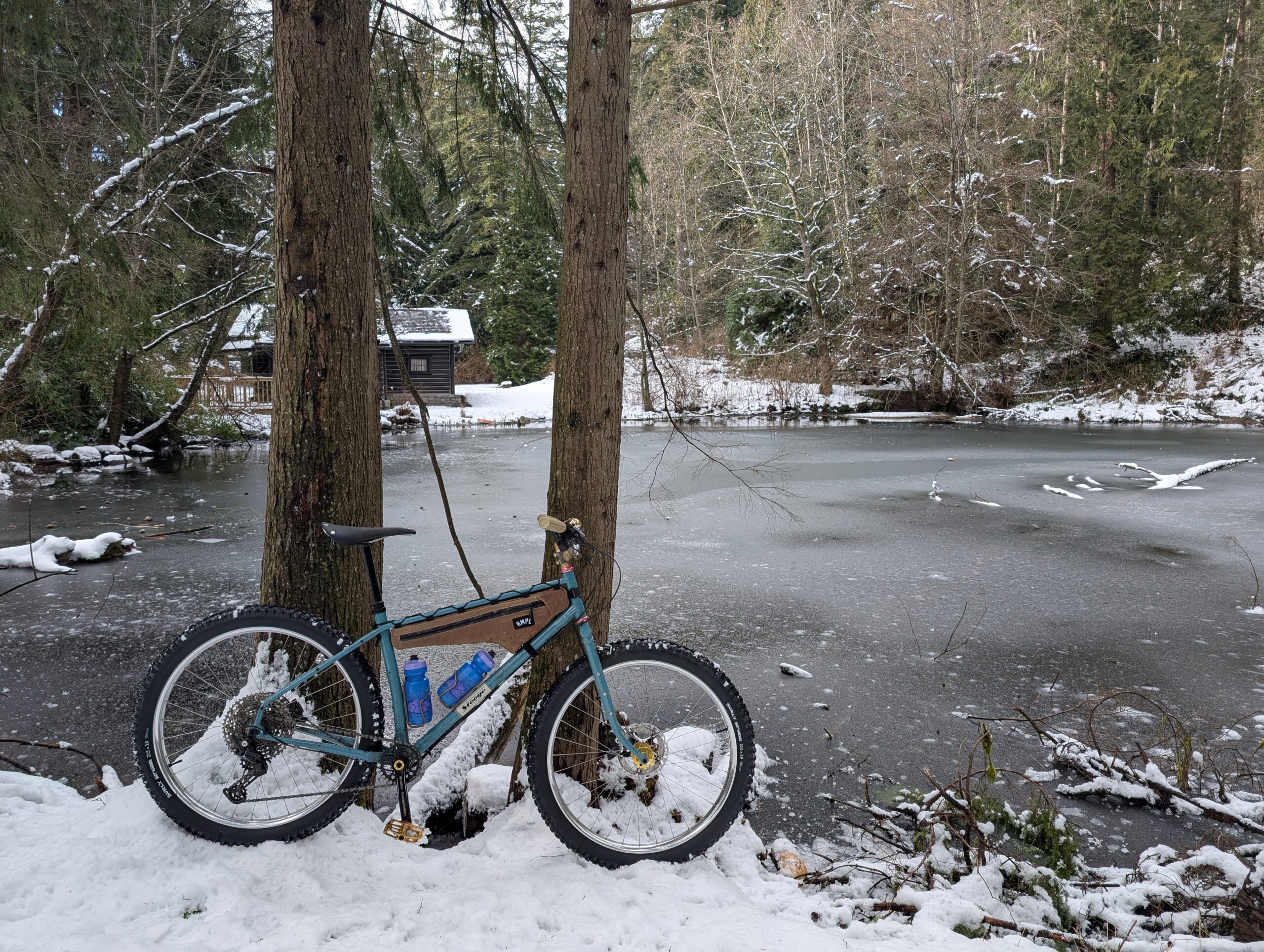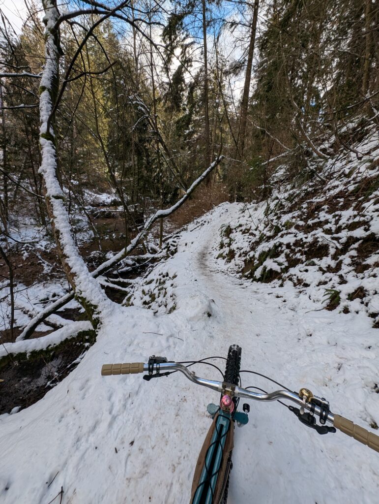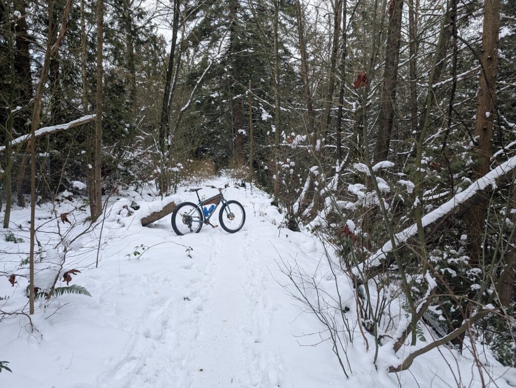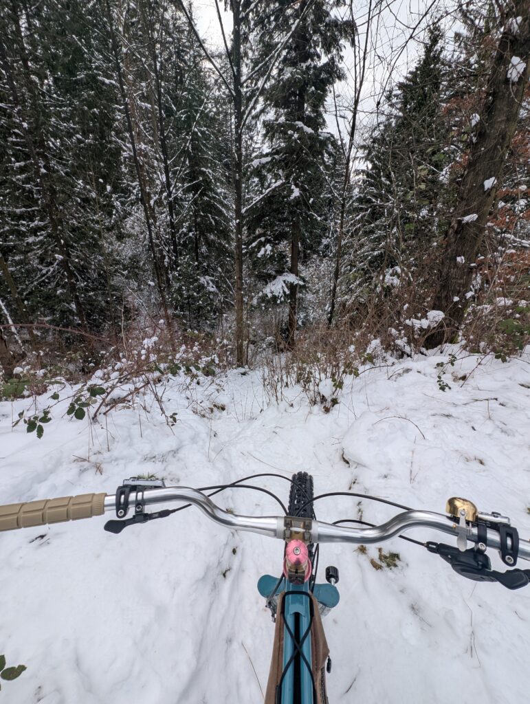 I was really impressed with the Dirt Wizard tires in the snow – I didn’t realize how slick things actually were until I tried to walk a section and realized it was a lot easier to ride than walk. Soon I will learn how brutally slow they are on pavement, but this day, they were the ideal choice. I took some pretty steep sections and had no issue with control! I worked my way through different forested areas westward, occasionally getting into some hike-a-bike, and picked up a couple beers from Beva Brewing to take up the hill to Murdo Frazer. I was delighted to find the pond frozen over, and enjoyed a beer in the tranquil spot which felt extra silent today.