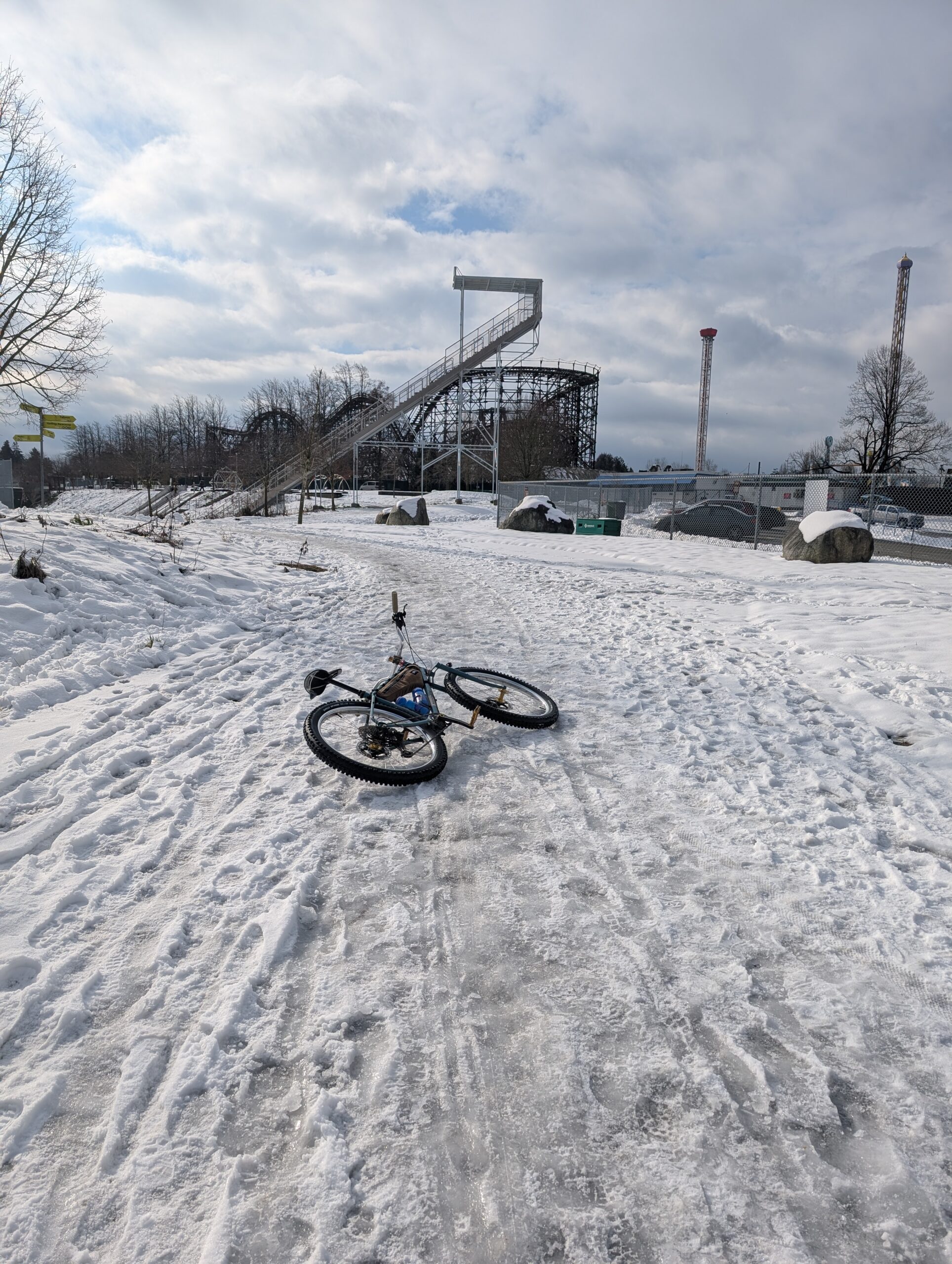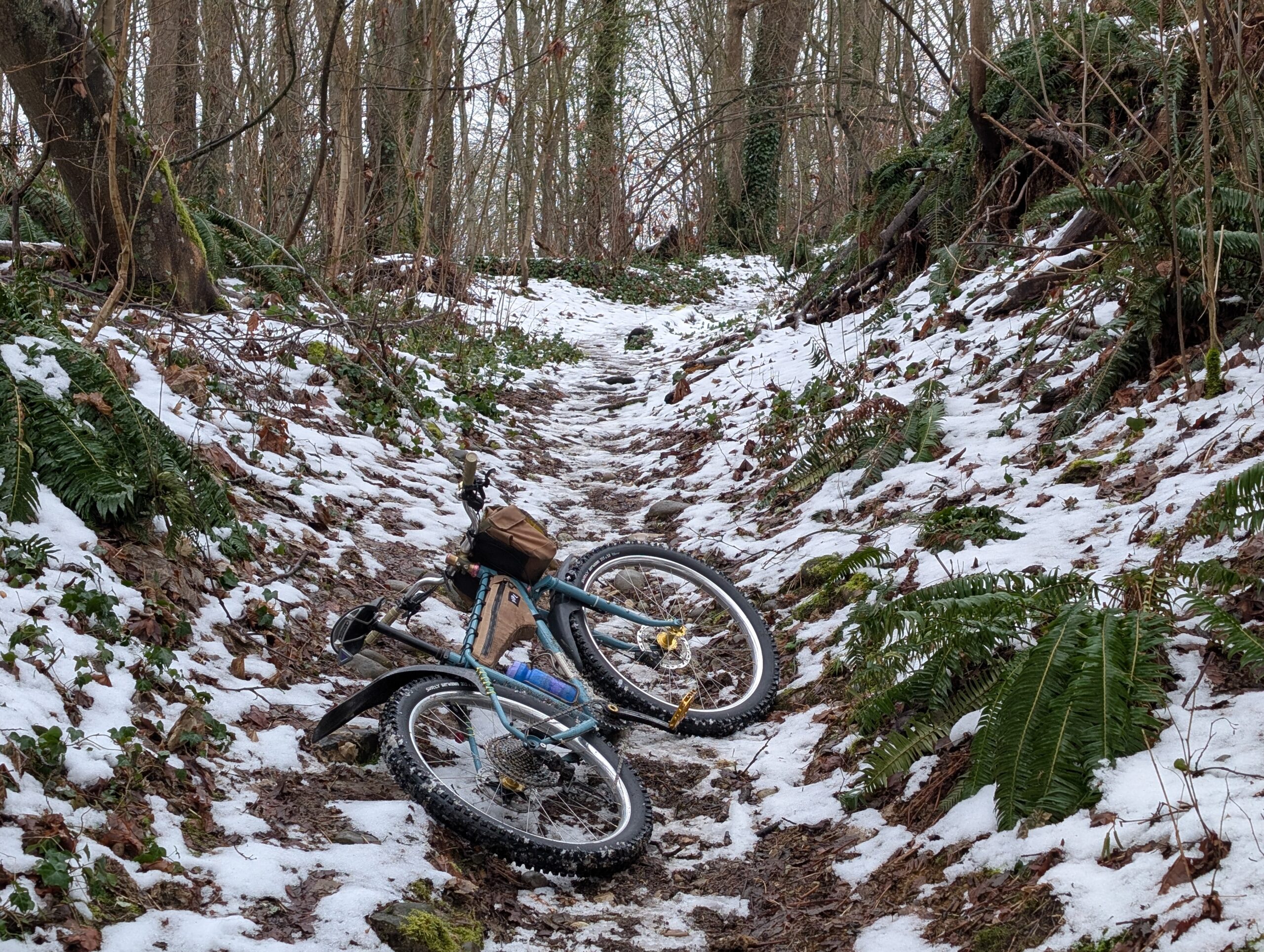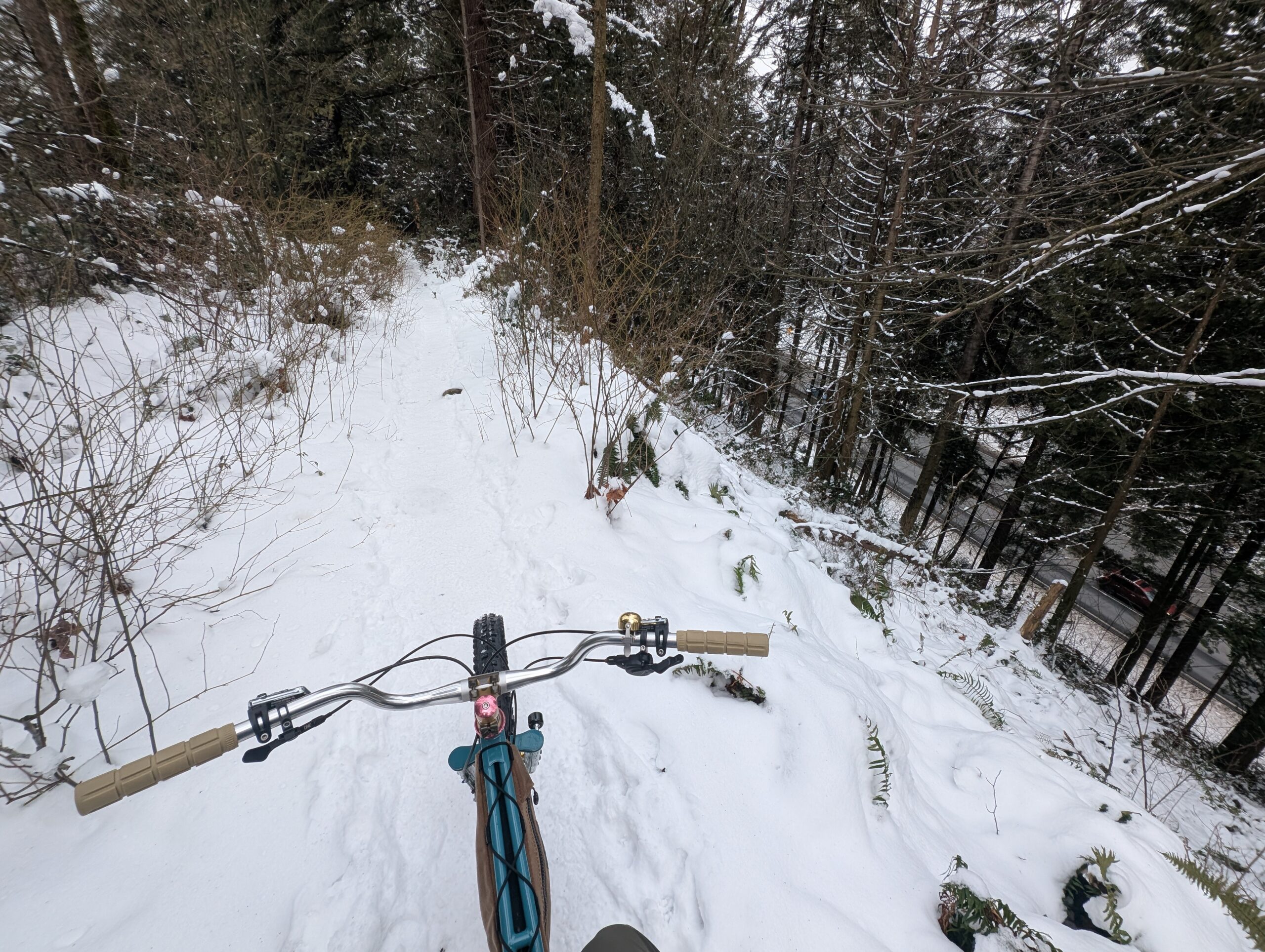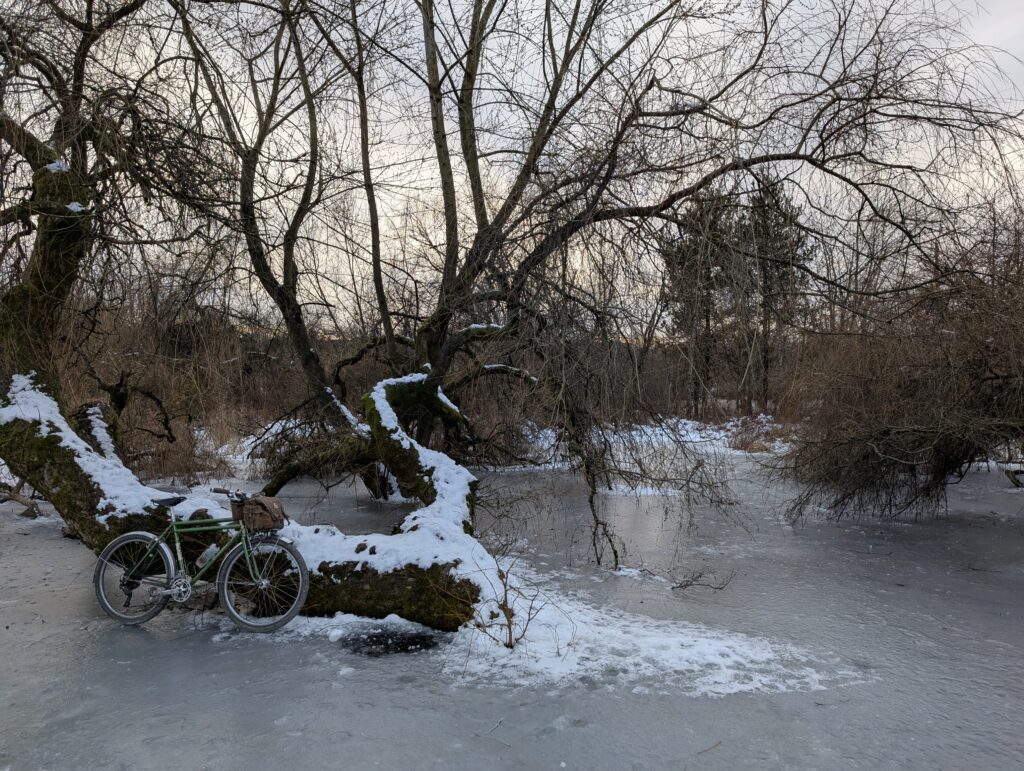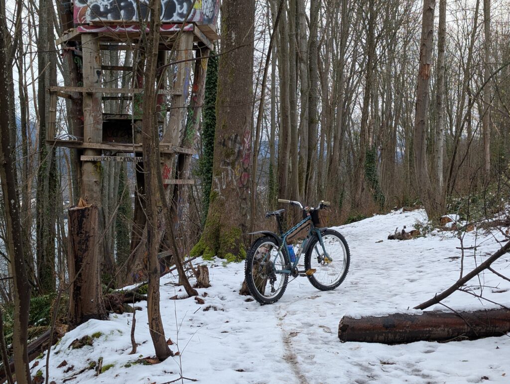 I was really impressed with the Dirt Wizard tires in the snow – I didn’t realize how slick things actually were until I tried to walk a section and realized it was a lot easier to ride than walk. Soon I will learn how brutally slow they are on pavement, but this day, they were the ideal choice. I took some pretty steep sections and had no issue with control! I worked my way through different forested areas westward, occasionally getting into some hike-a-bike, and picked up a couple beers from Beva Brewing to take up the hill to Murdo Frazer. I was delighted to find the pond frozen over, and enjoyed a beer in the tranquil spot which felt extra silent today.