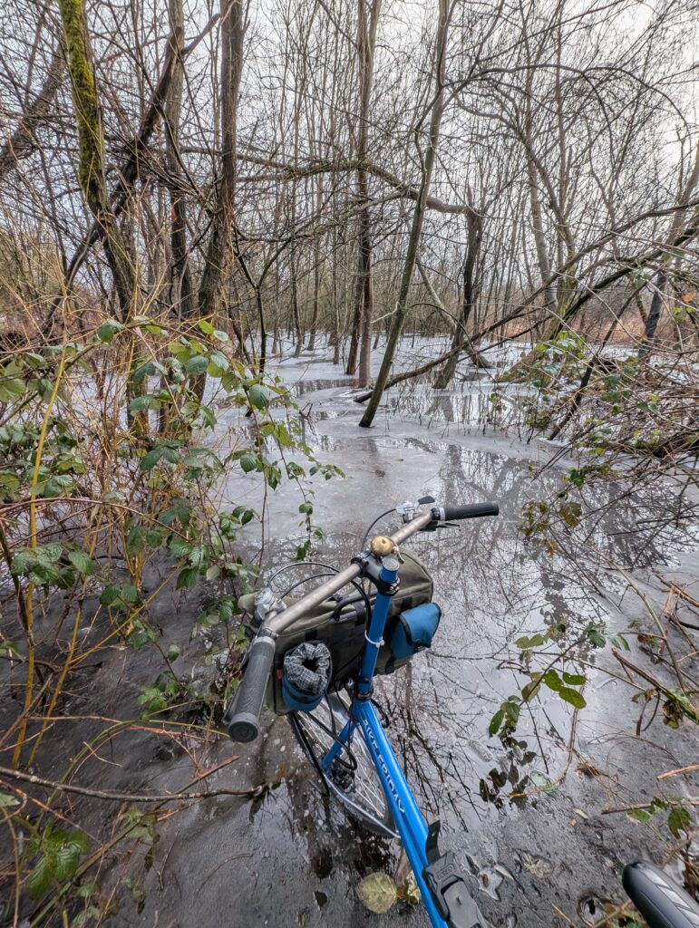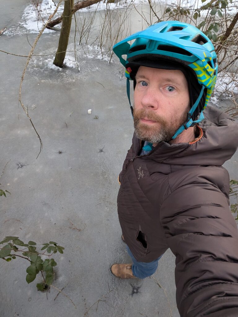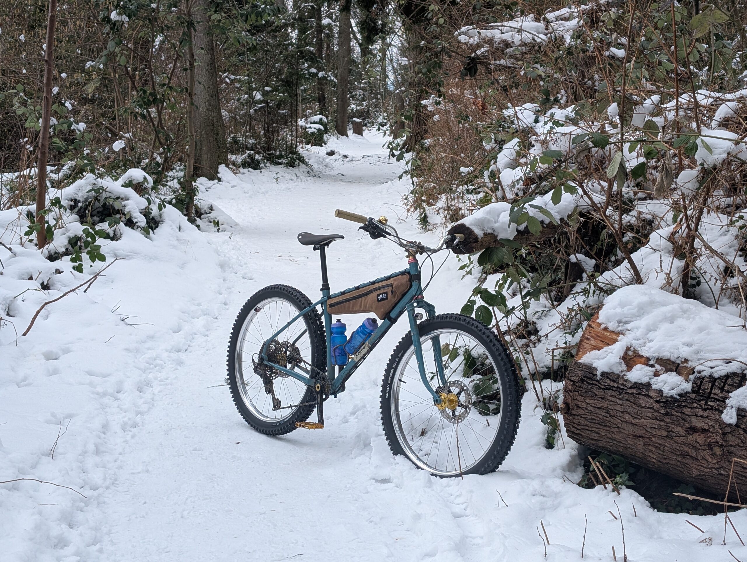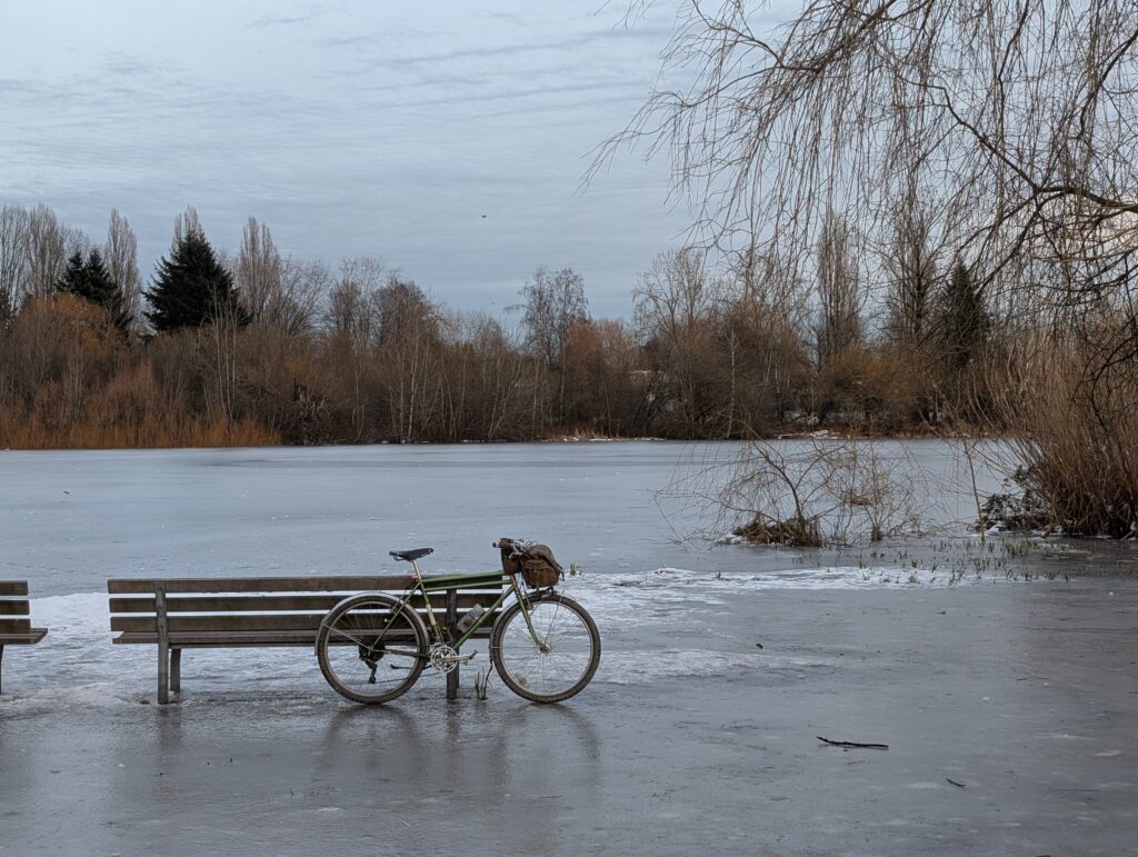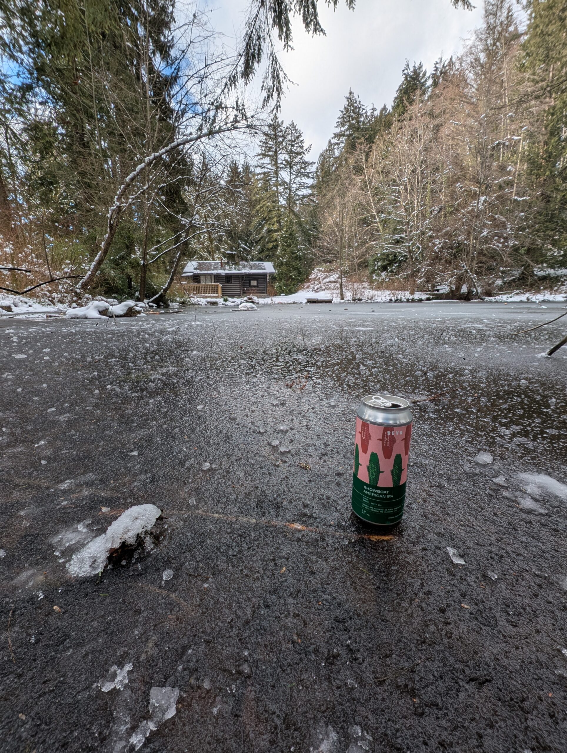 I was really impressed with the Dirt Wizard tires in the snow – I didn’t realize how slick things actually were until I tried to walk a section and realized it was a lot easier to ride than walk. Soon I will learn how brutally slow they are on pavement, but this day, they were the ideal choice. I took some pretty steep sections and had no issue with control! I worked my way through different forested areas westward, occasionally getting into some hike-a-bike, and picked up a couple beers from Beva Brewing to take up the hill to Murdo Frazer. I was delighted to find the pond frozen over, and enjoyed a beer in the tranquil spot which felt extra silent today.