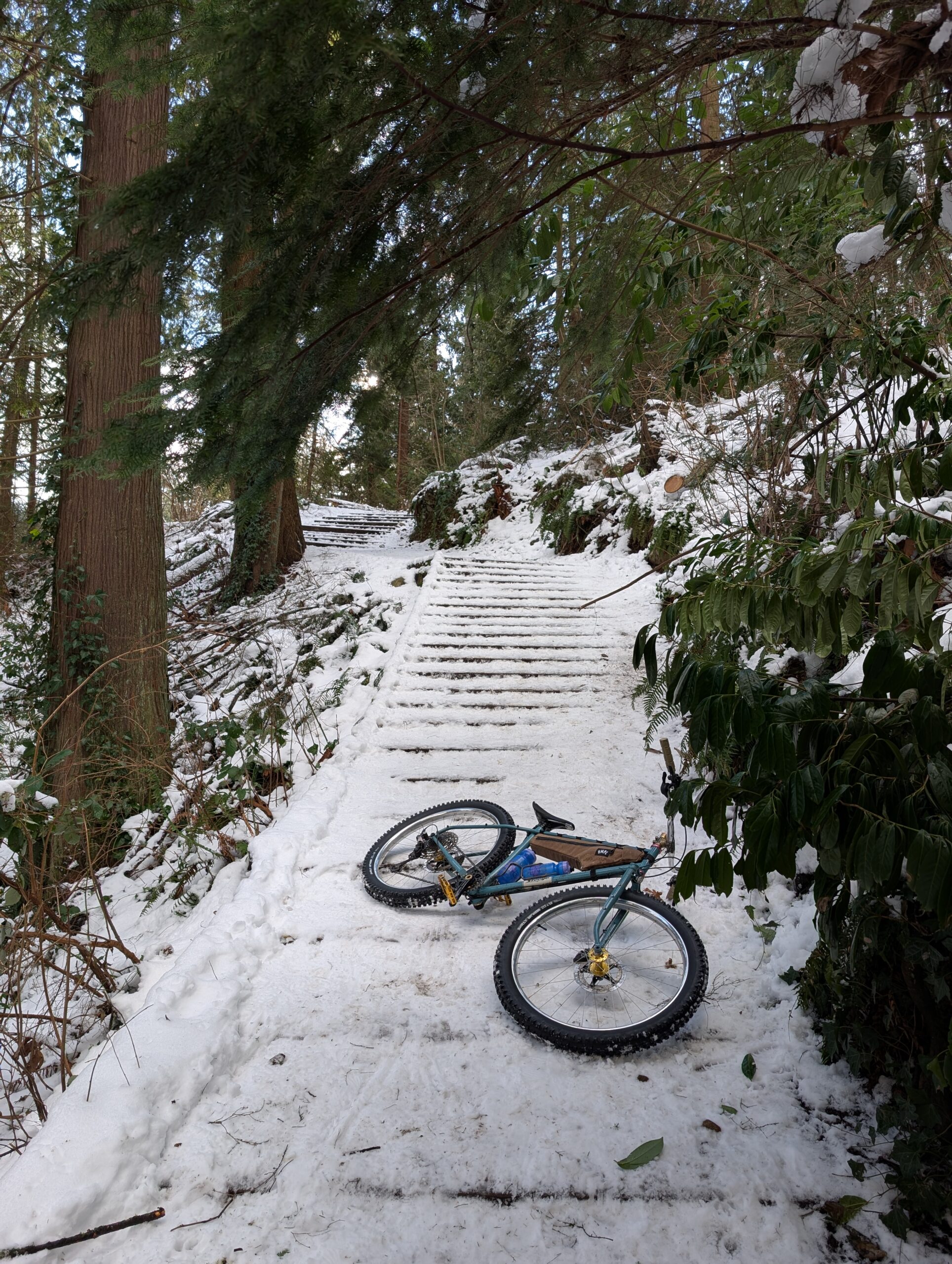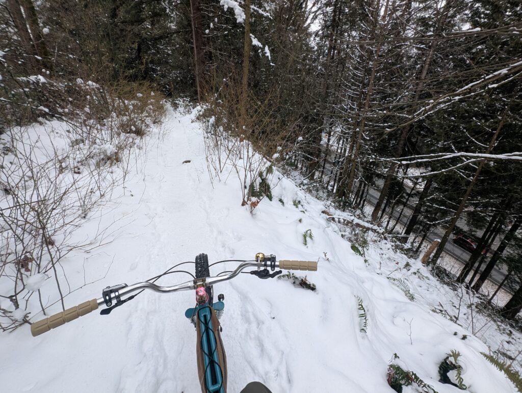 The new wheels for my Stooge were ready though, and I was able to pick them up so I could go play in the snow on the 3″ knobby Surly tires I had been hoarding in my bin for a while. This was now February 8th that I set out on the Stooge, again not really sure where or how far I would go. The icy streets in our neighbourhood had me thinking it would be a very short ride, but I pushed on to north Vancouver where I found the snow was a lot better. I pushed onwards and upwards, climbing alongside “the cut” of Hwy 1 which leads to “the upper levels” stretch of the highway.