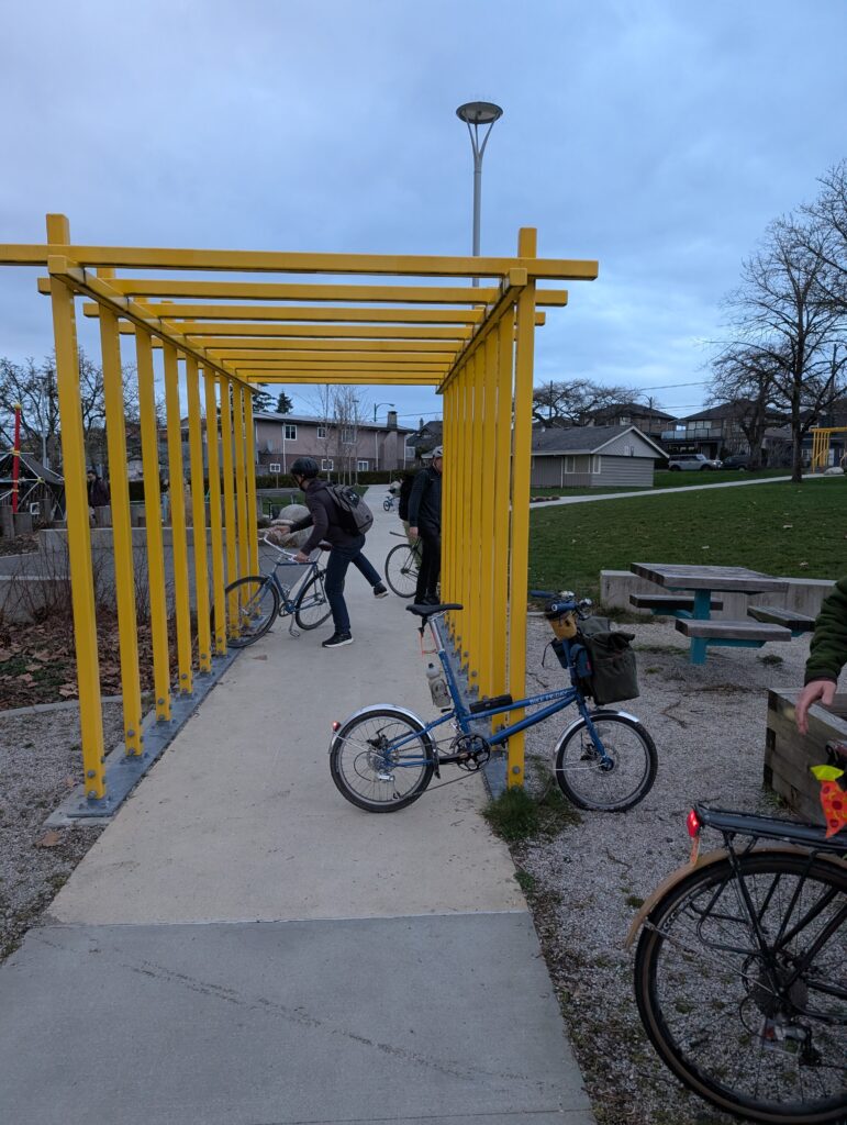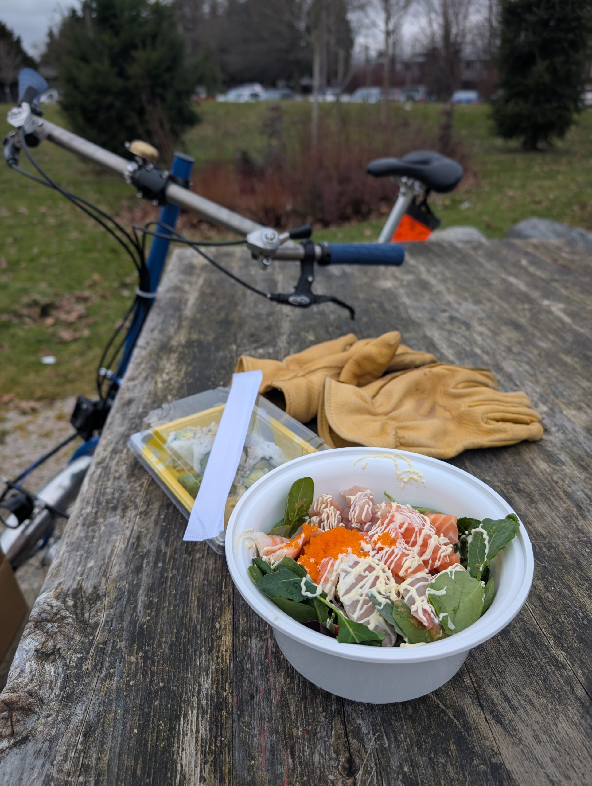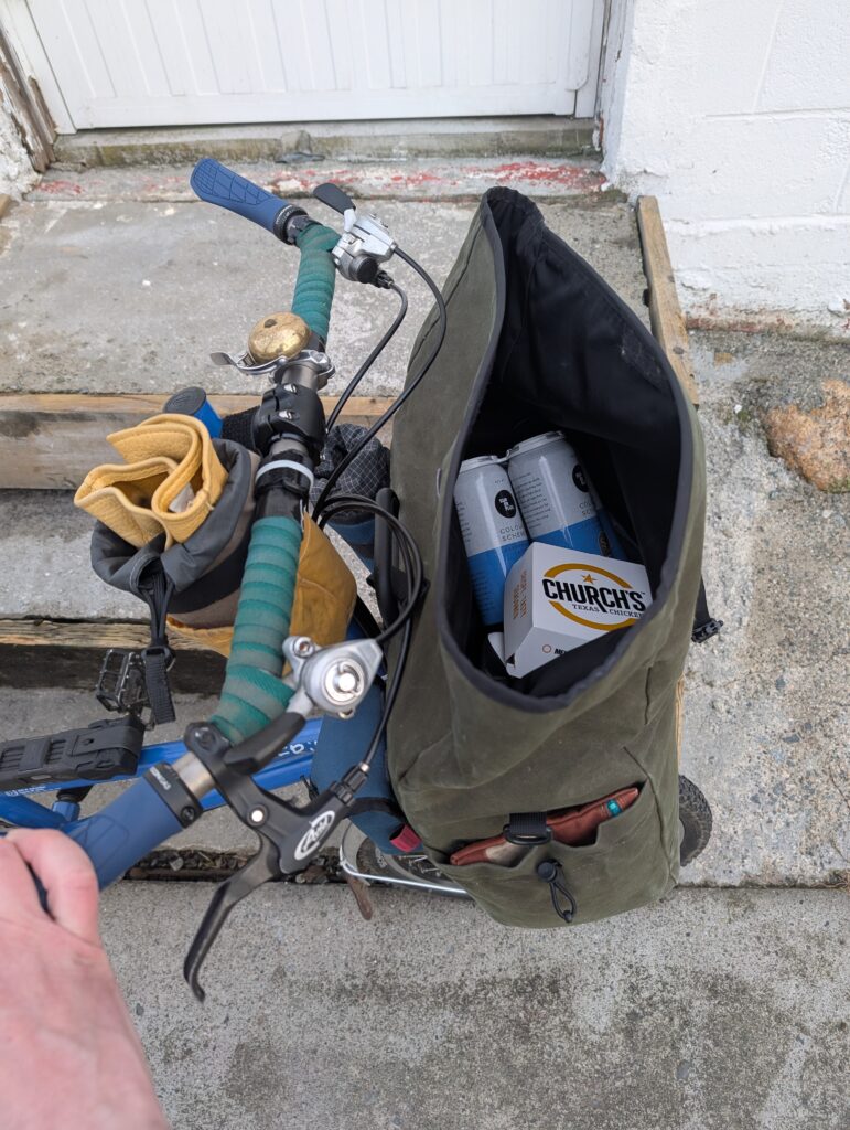 I got some more rides in on the Bike Friday in the last week of February – a sun-soaked commute with parkbagging afterwards as well as the first TCR of the 2025 season with my slack pals. Somehow the only photo I got from parkbagging was of my food and beer haul en route.