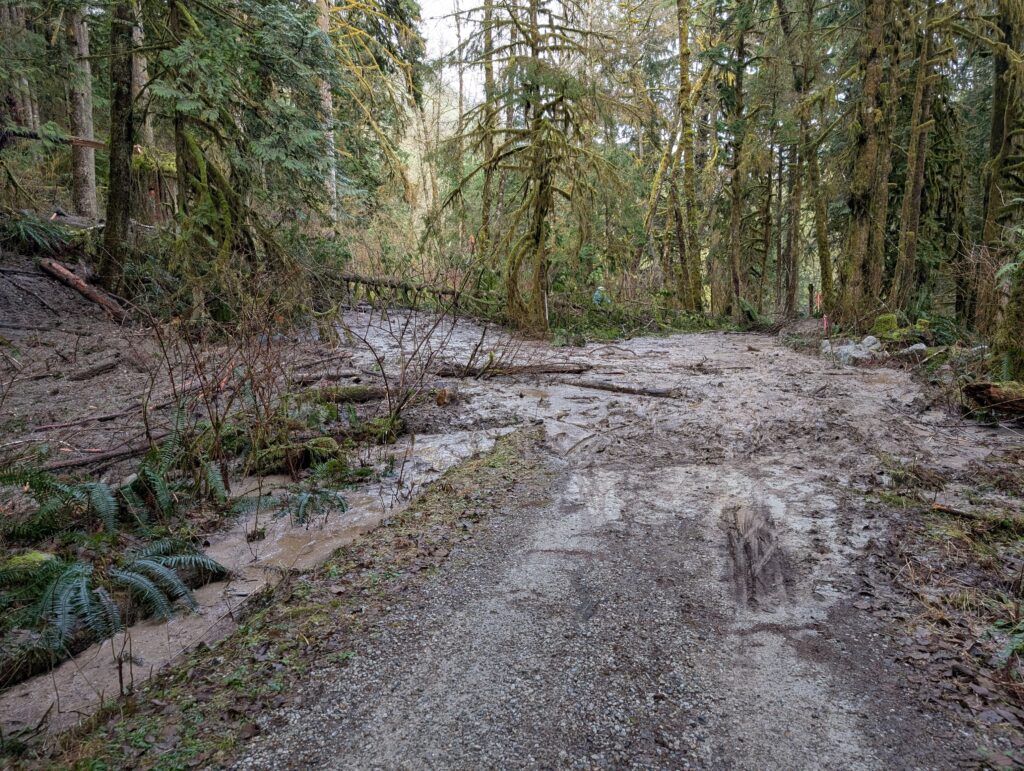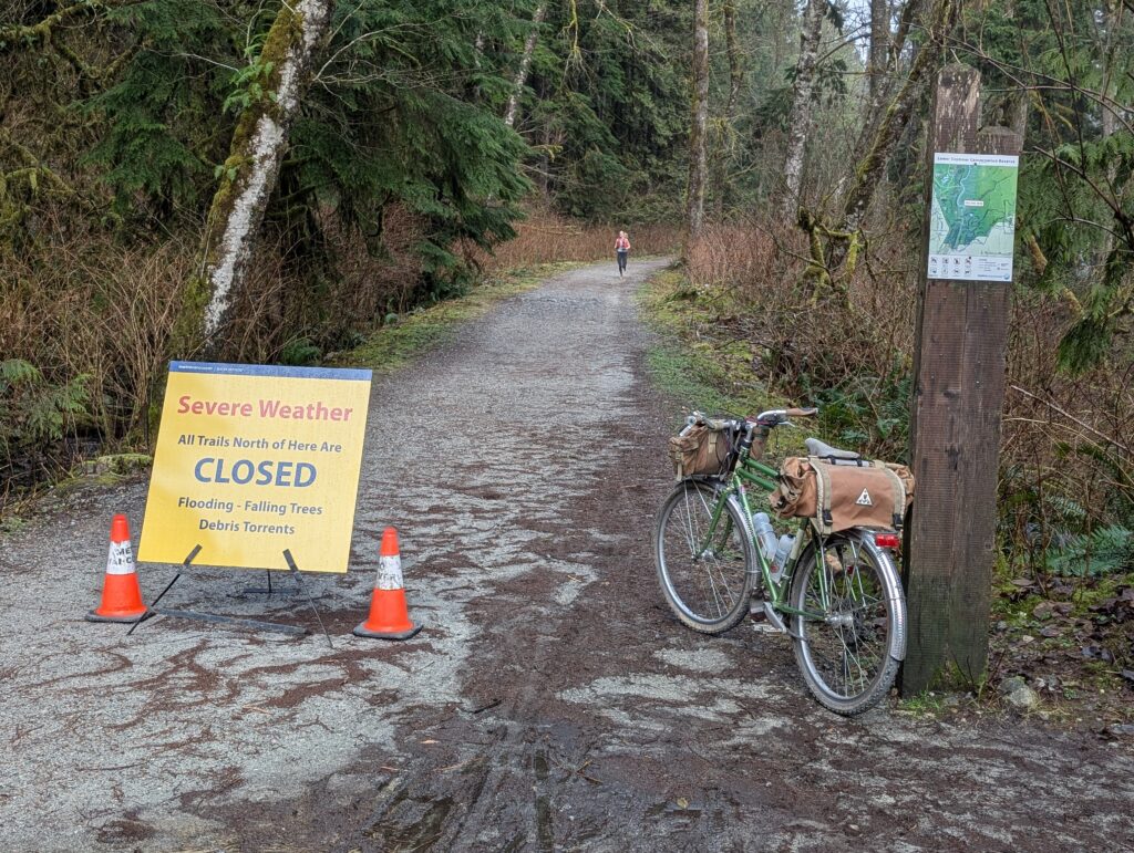 Along came the weekend of the 22nd/23rd, and it poured with rain on Saturday so I stayed off the bike. A couple friends were riding the Seymour valley that day though and came back with tales of a mudslide along Fisherman’s – and I decided on Sunday, when the weather was much improved, to go check it out. At the last fork in the trail there was a sign indicating what to expect; but it wasn’t exactly stopping anyone. A runner came through with muddy feet – I had to go get mine muddy too.