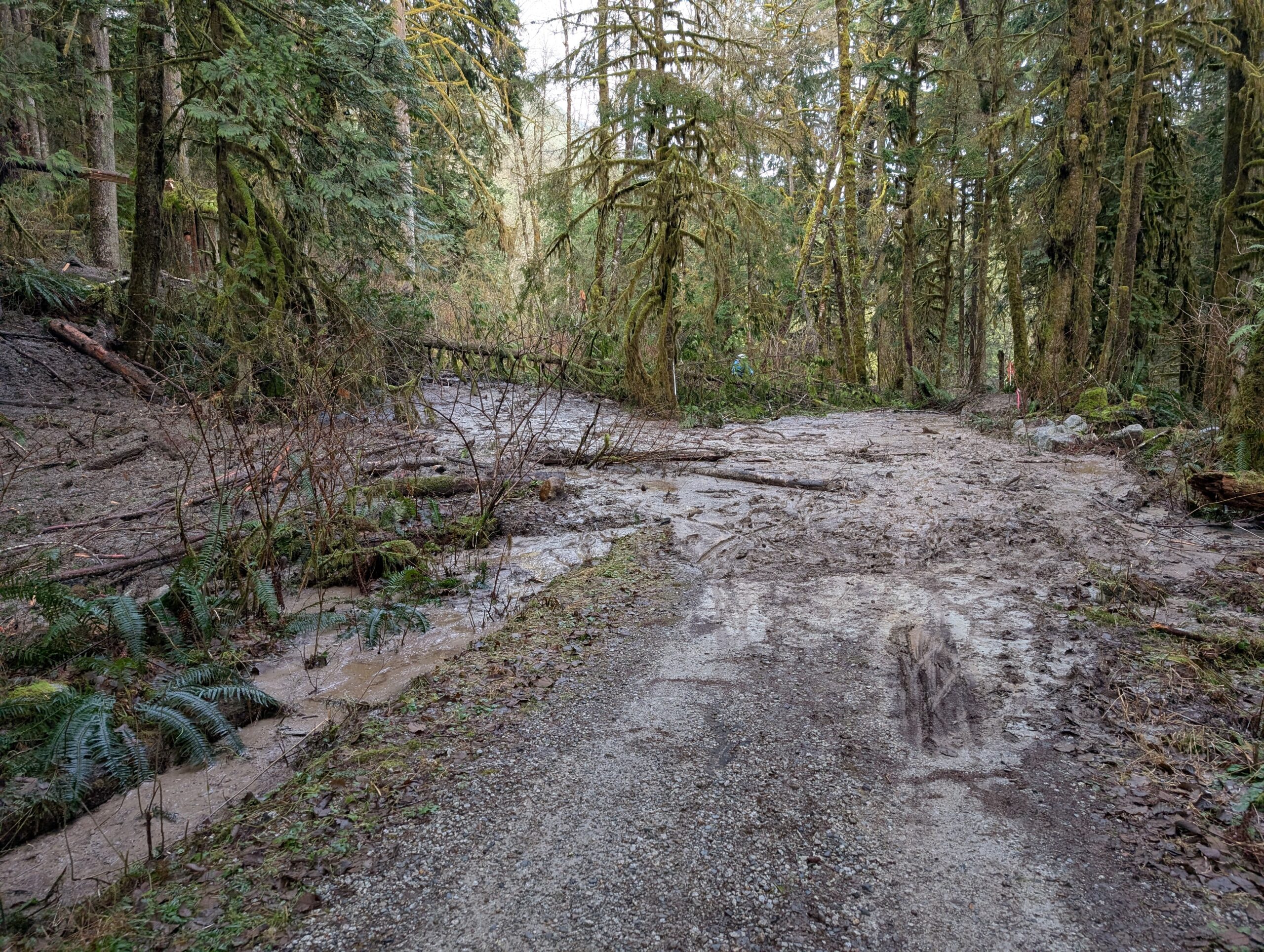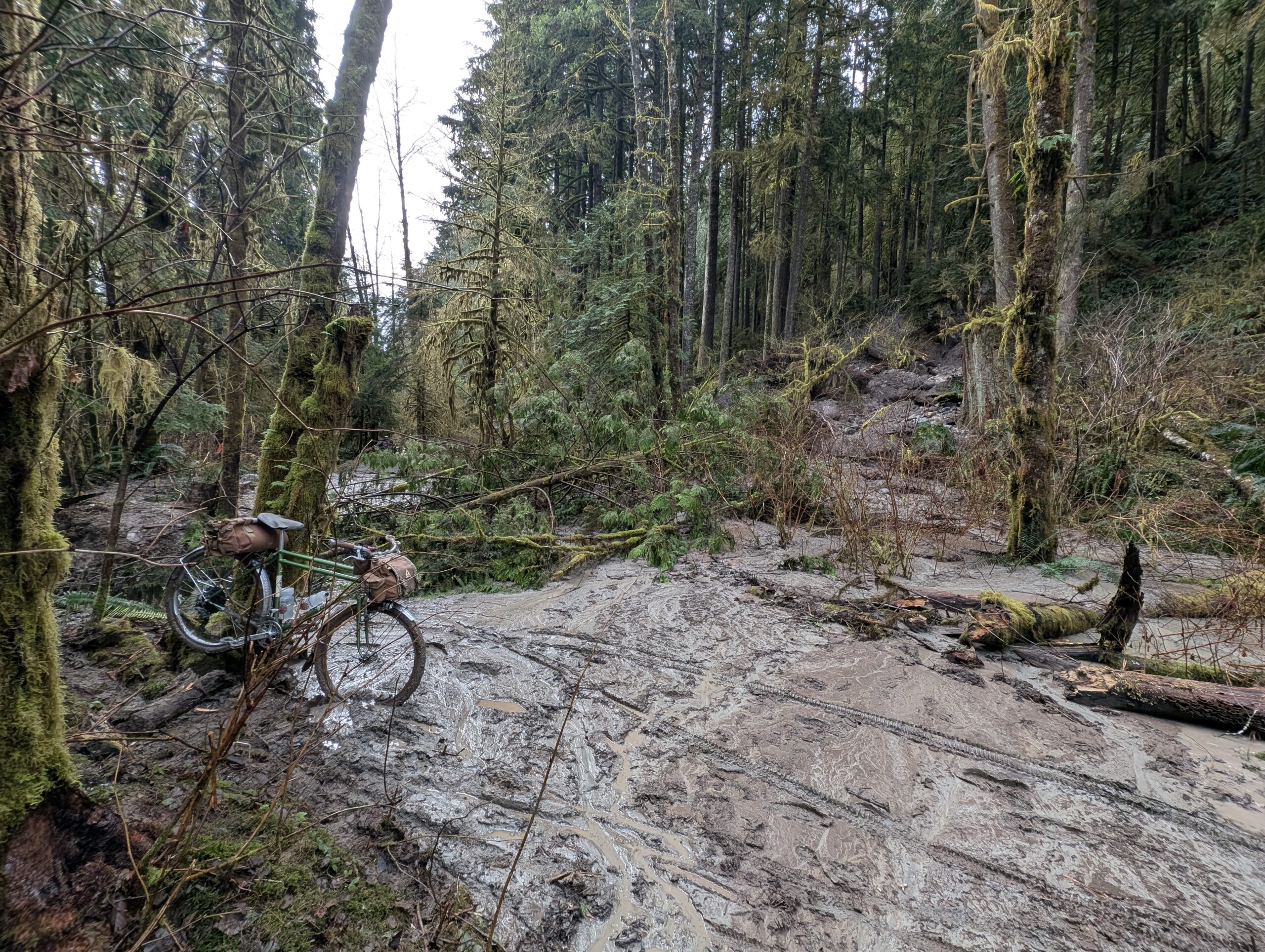 I reached the mud slide, which was located just a few hundred feet before where the trail had significantly washed out a couple years ago. It was quite a spectacle, but indeed passable – though not without getting pretty muddy.
