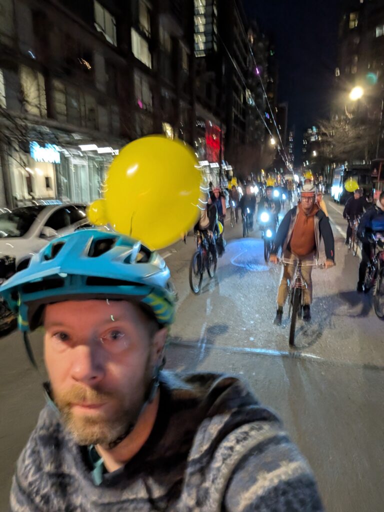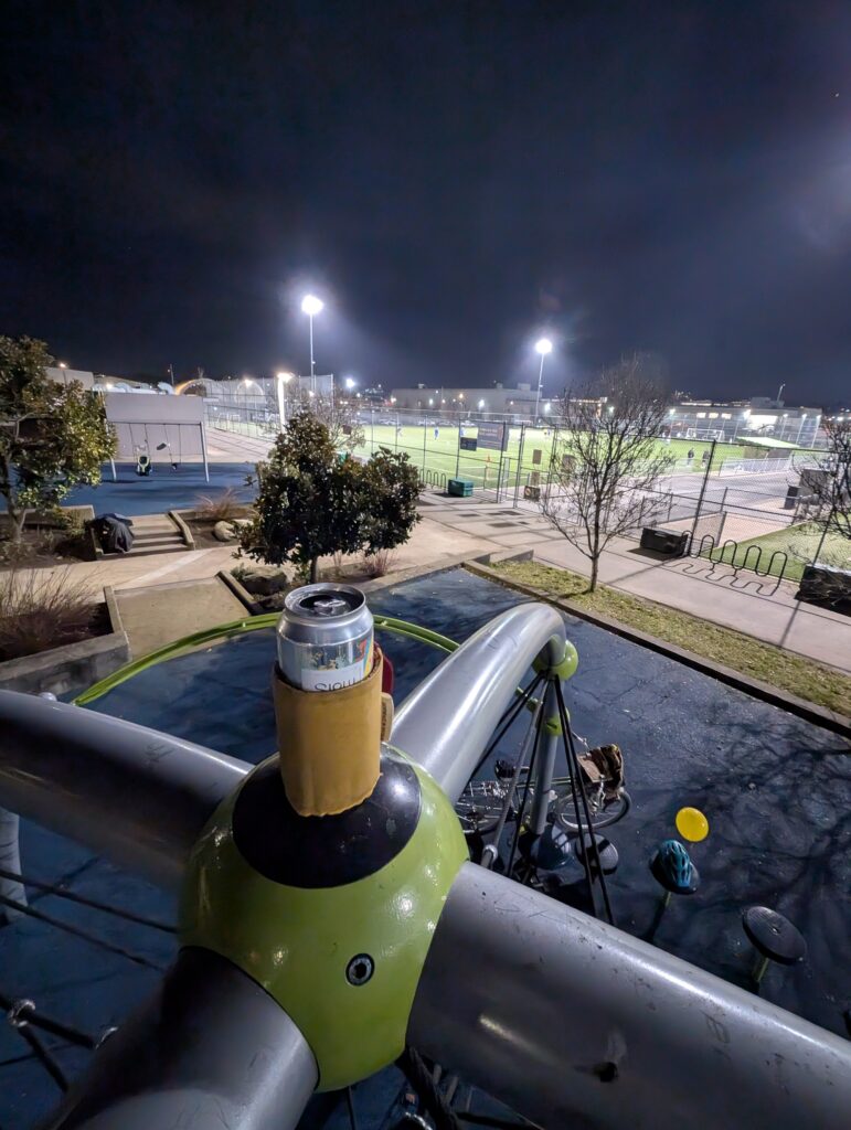 The last day of February coincided with the last Friday of the month, which meant it was Critical Mass. I decided to go this time, along with my pal Graham. It was the smallest CM I’ve been to yet and as a result it was the most uncomfortable. Both Graham and I needed to calm our nerves afterwards and chose to do so by enjoying a beer at the top of a playground climbing structure. Always a good move as long as it’s after dark and there are no children!