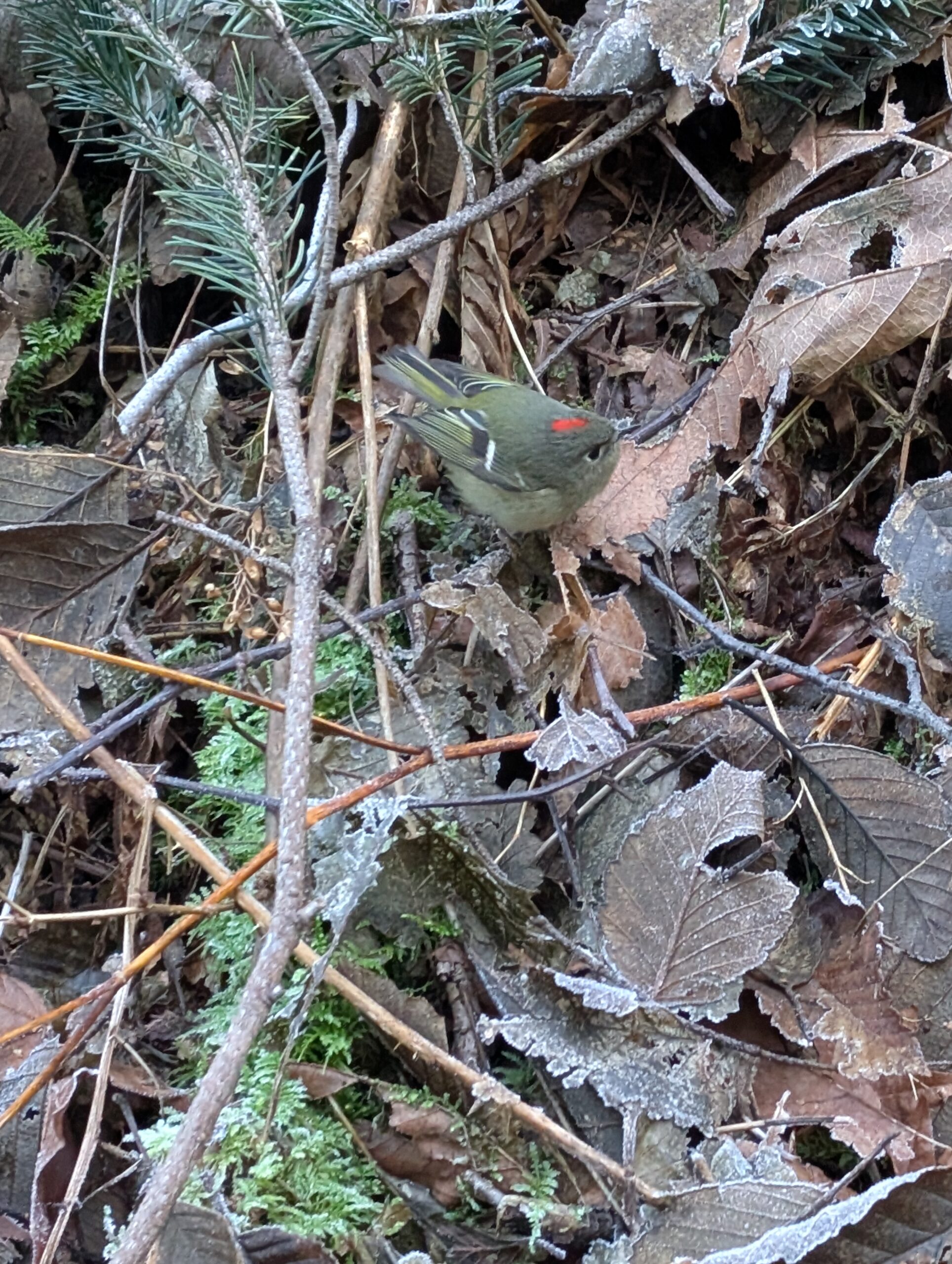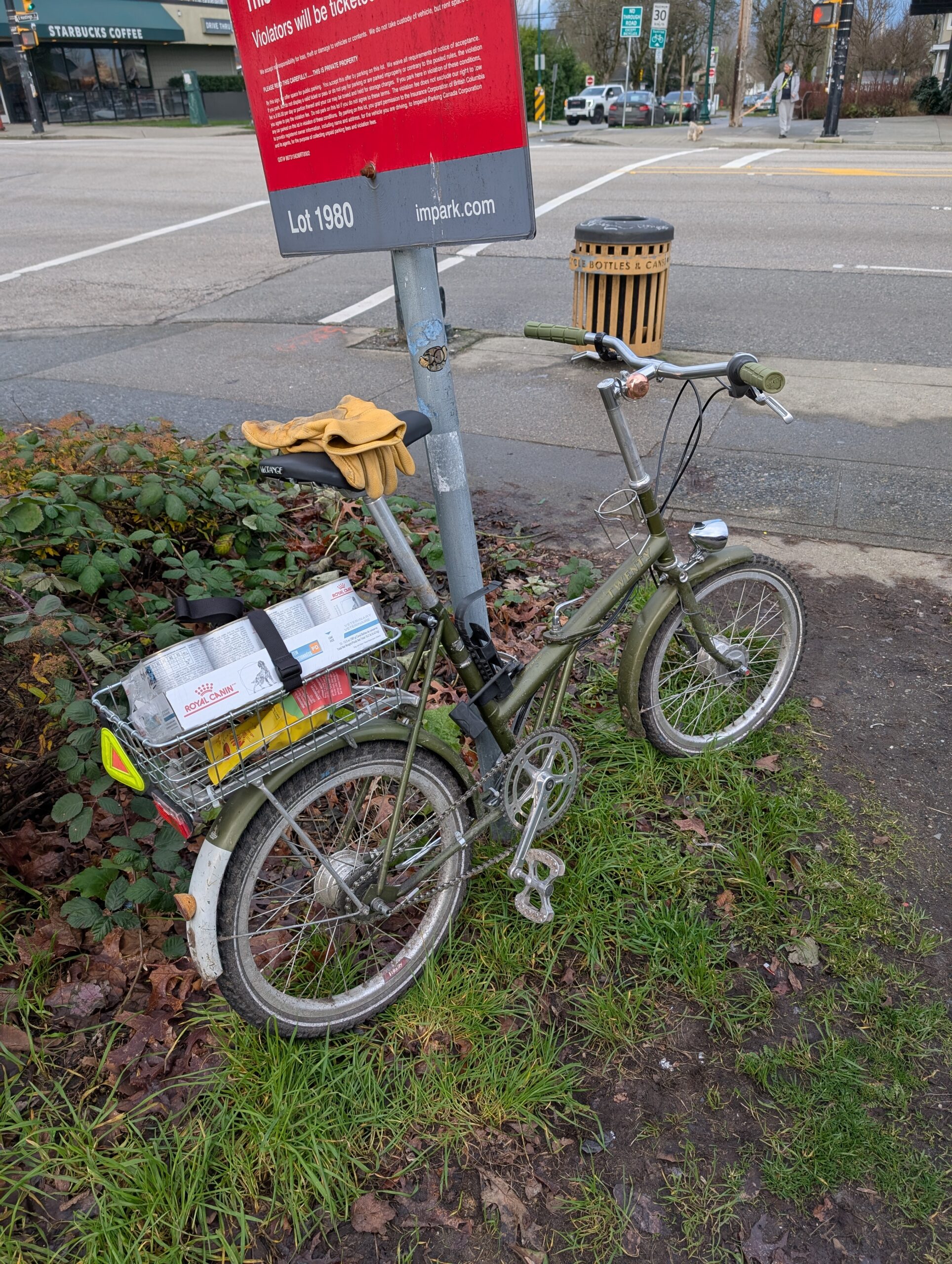 On Saturday, January 25th there was an edition of parkbagging, which I rode the Bike Friday to. It was very chilly but we got a good turnout. I only took one kind of crappy photo though, below left. On the Sunday though I got out for a loop of Burnaby Mountain while it was below freezing, and with the north aspect, it was well frosted. I also spotted something flitting about in the shrubs, a Ruby Crowned Kinglet it turned out! I followed it along for quite a while, trying to get a good photo. They never stop moving!