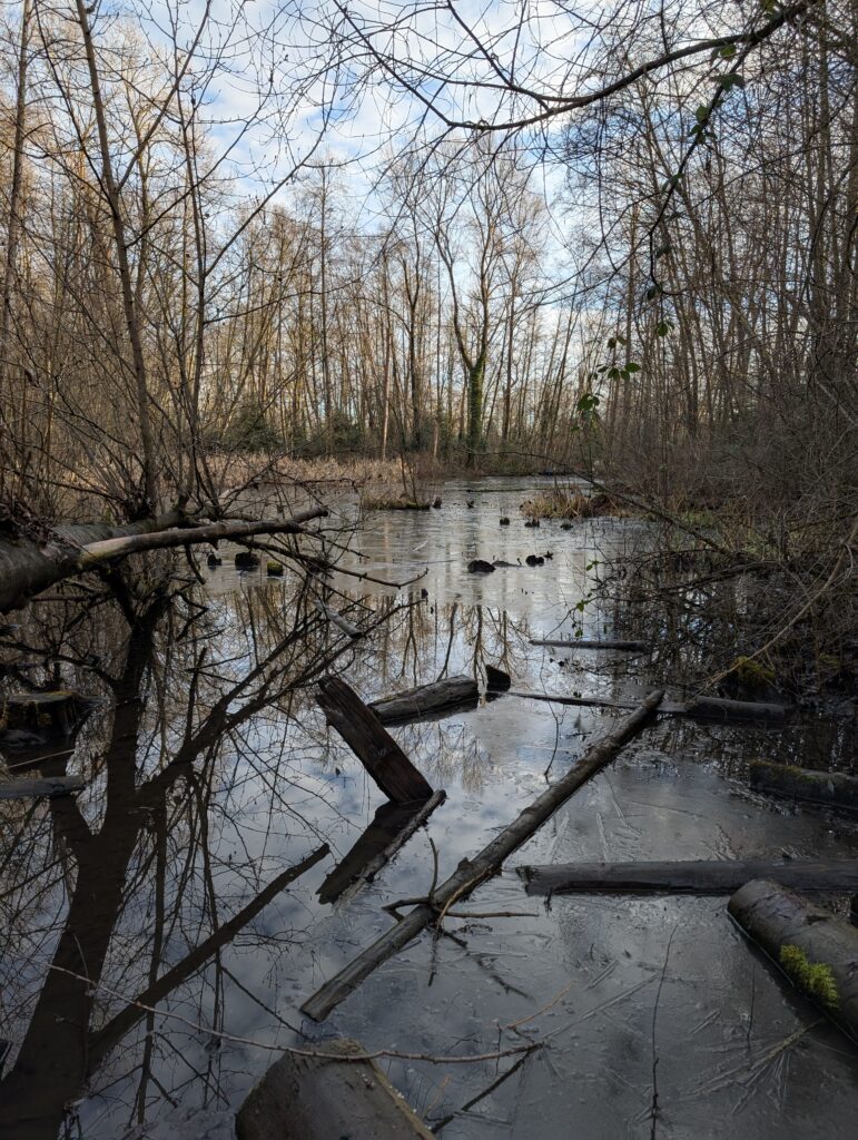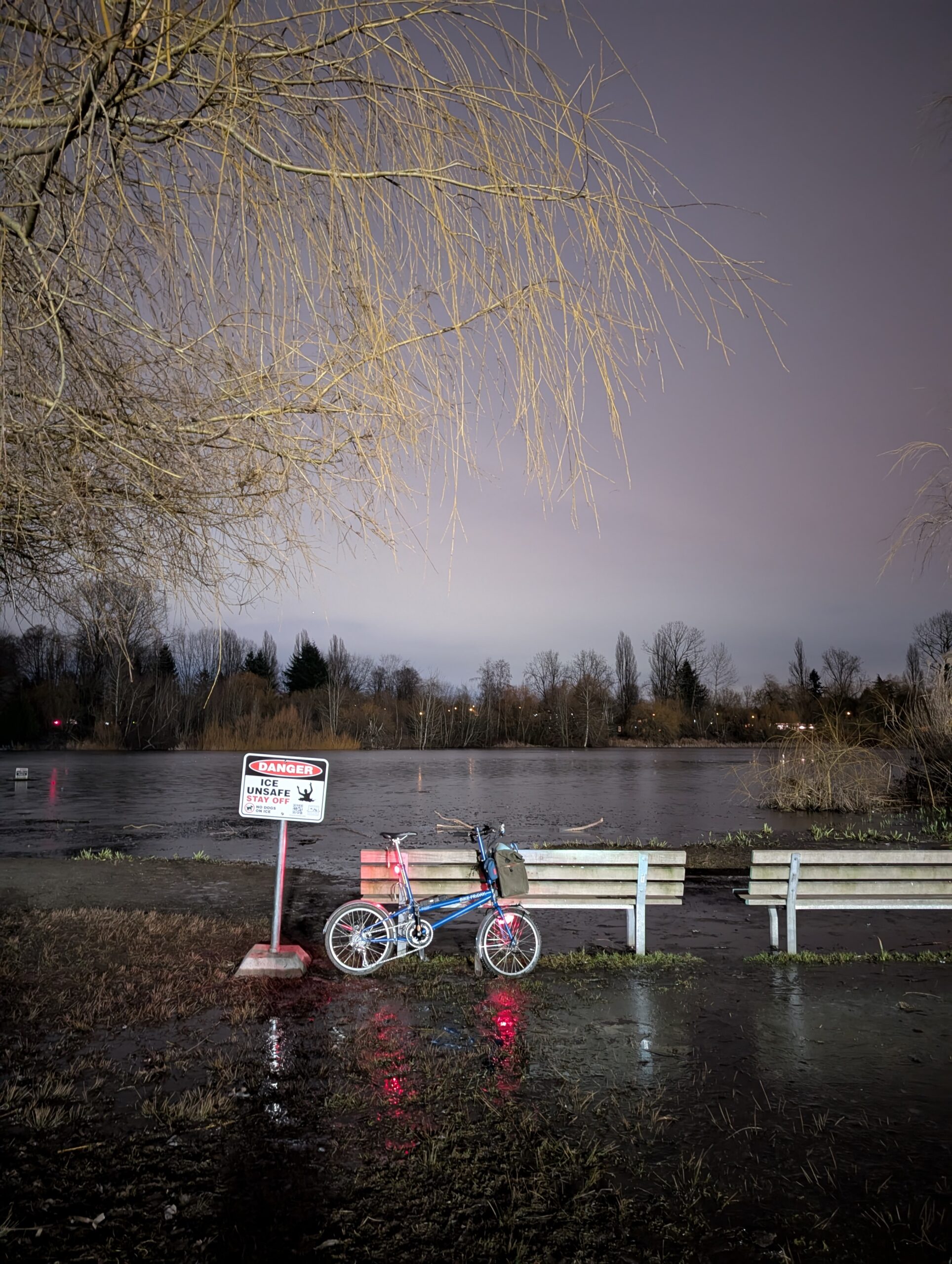 A few days later, Saturday January 18th, I delivered the polished Velocity Dually rims I purchased for the Stooge up to Kissing Crows Cyclery – and then traversed the south side of Vancouver eastwards into Burnaby and visited one of my favourite ponds, tucked within Everett Crowley Park. It was quite cold, and a thin layer of ice had built up on the pond.