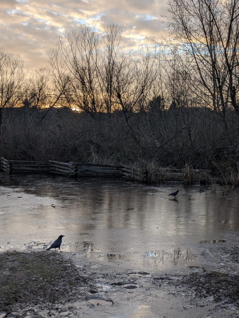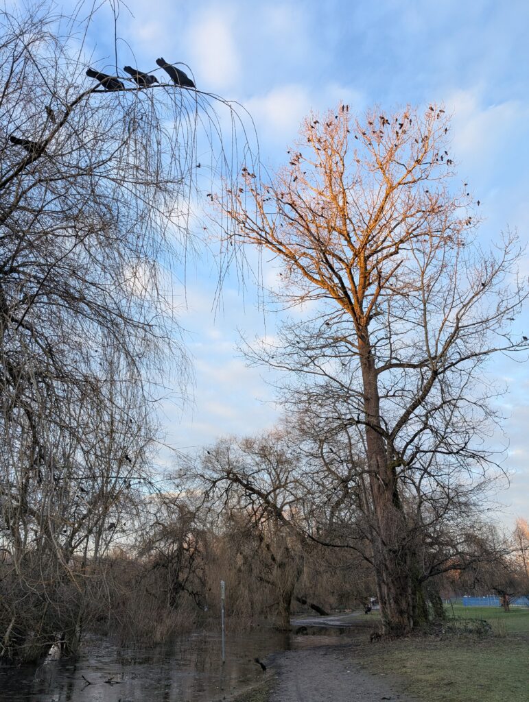 On my way home I passed through Trout Lake again and found it was similarly icing over. Also, the crows had recently starting collecting here to roost in the evenings, and the noise and atmosphere was quite something.