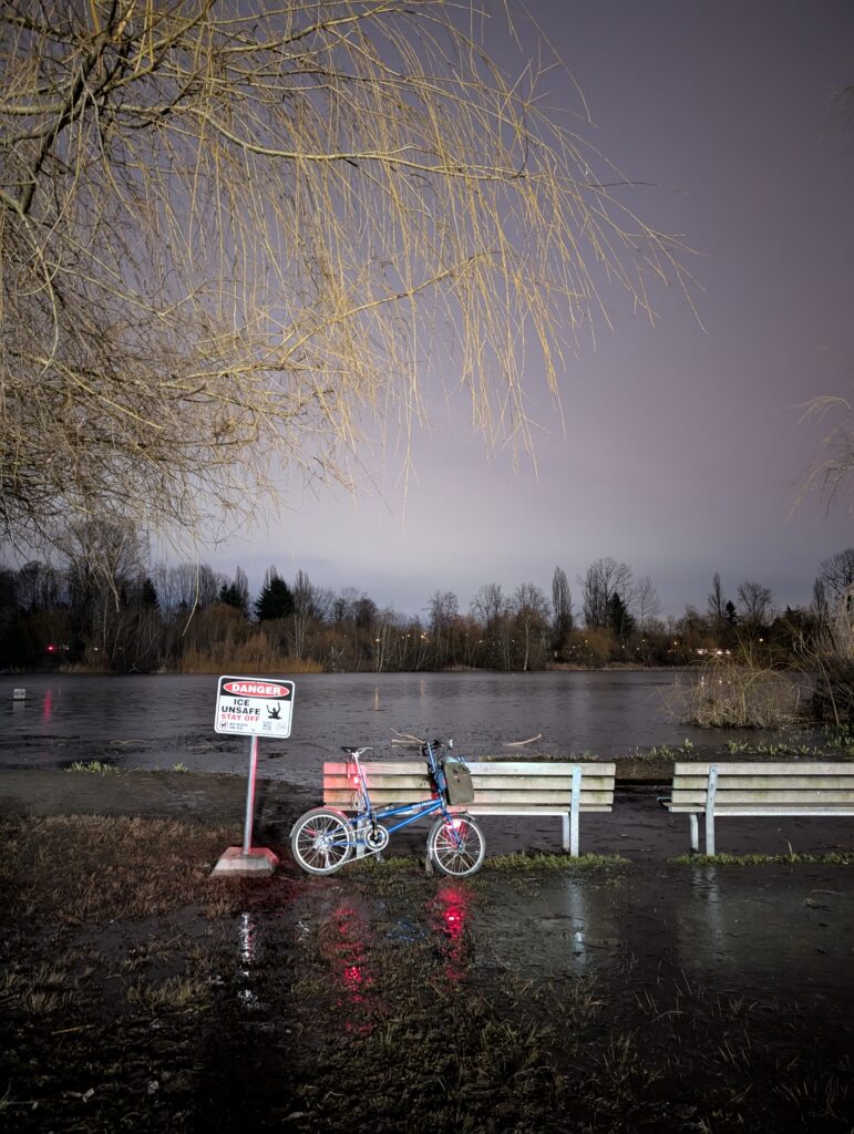 It started to get colder over the next few days but I managed to ride to work on the 23rd in sub-zero temps, taking advantage of the Bike Friday upgrades to carry my work gear in the Brompton bag. The same flooded benches from above were now in ice. Oh, and a photo of Leia for good measure.