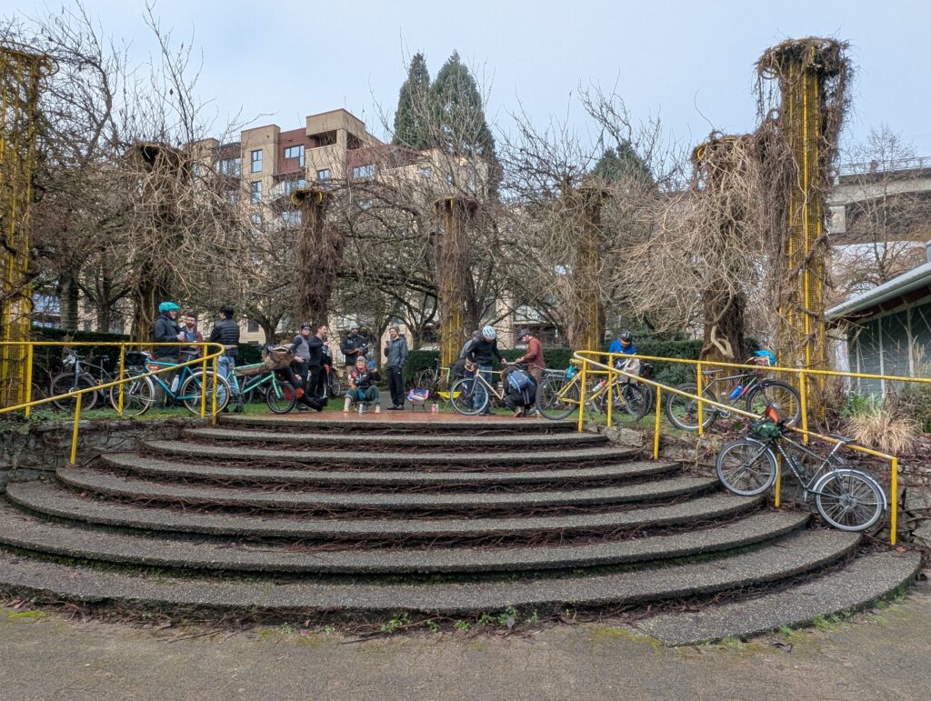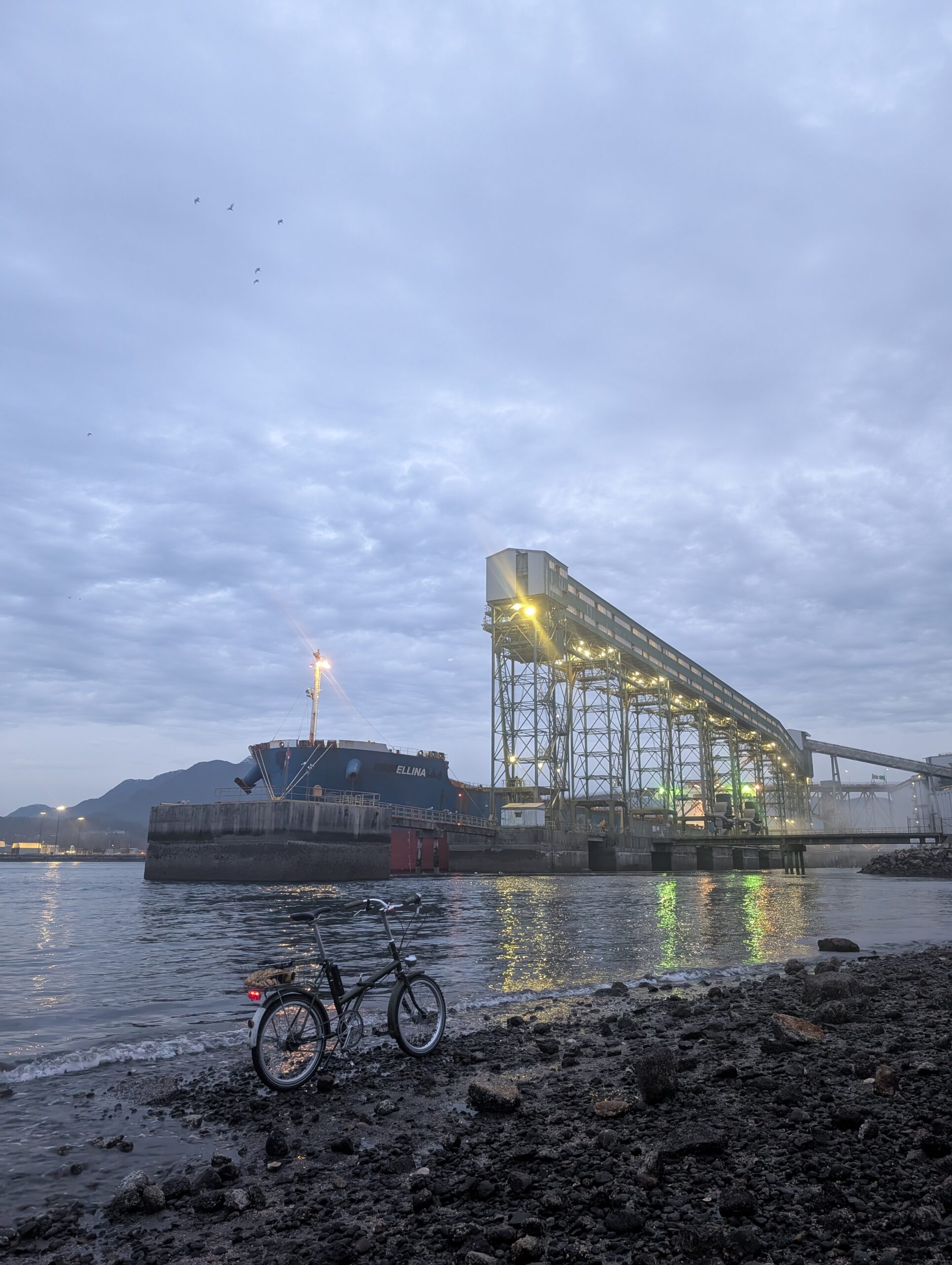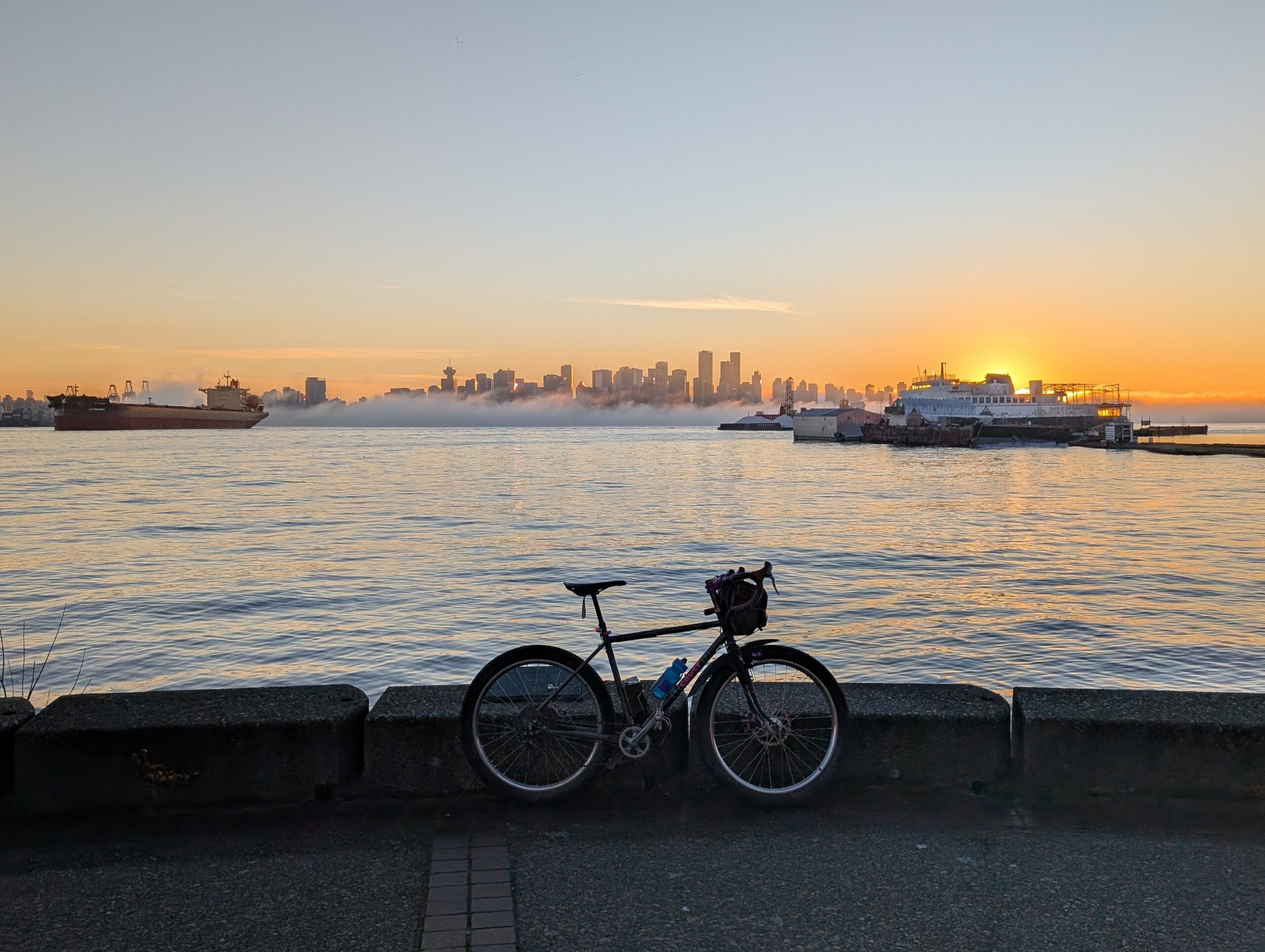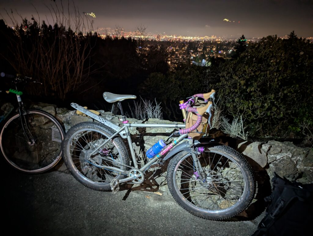 On the 17th, a Friday, I left home for the downtown waterfront to meet up with Rob for a cold one in the cold air. The days are inching longer, not entirely dark when I get off work at 5pm now, but the light was all but gone by the time I made it into town. We rode into Stanley Park and followed some gravel paths before working eastwards towards my neighbourhood.