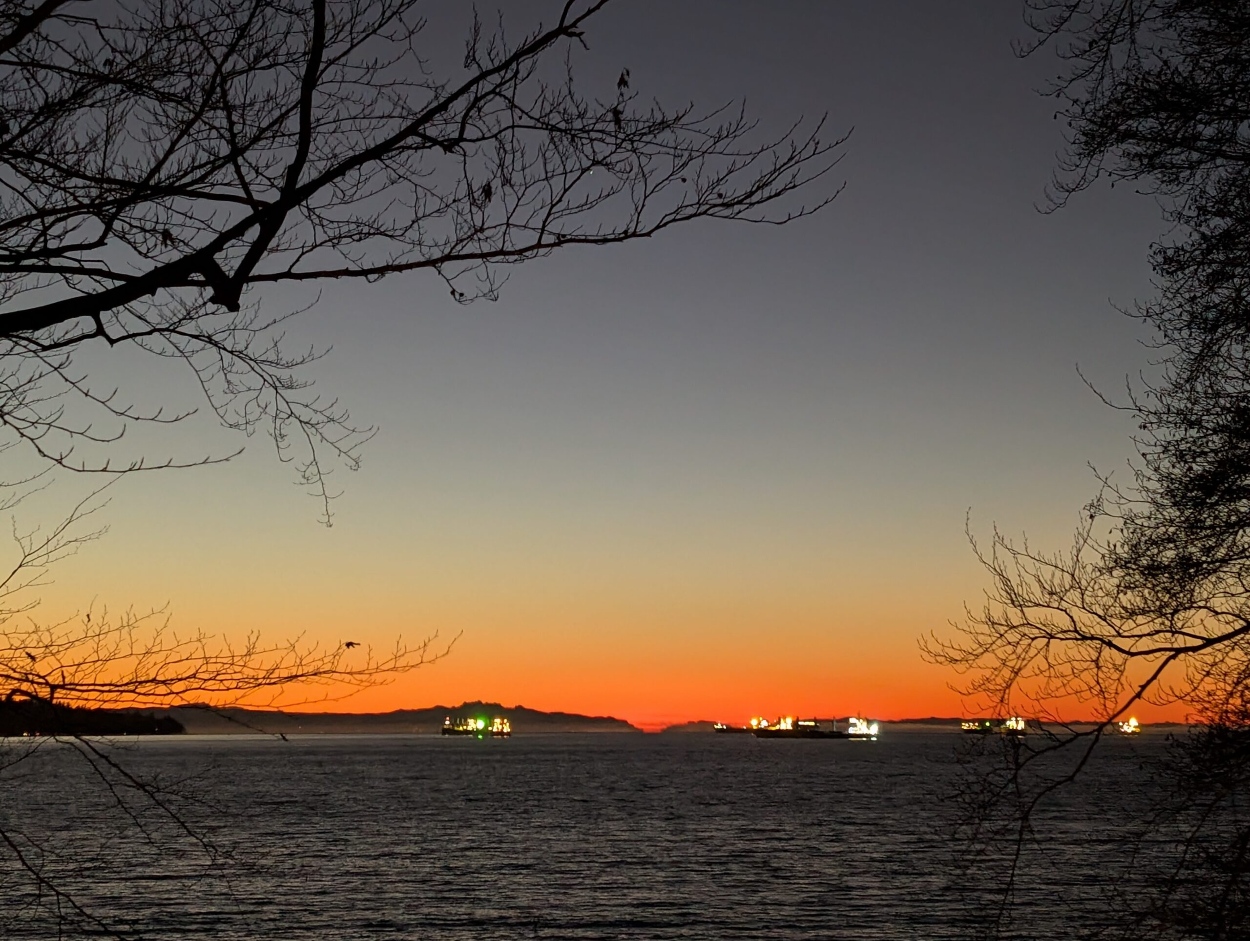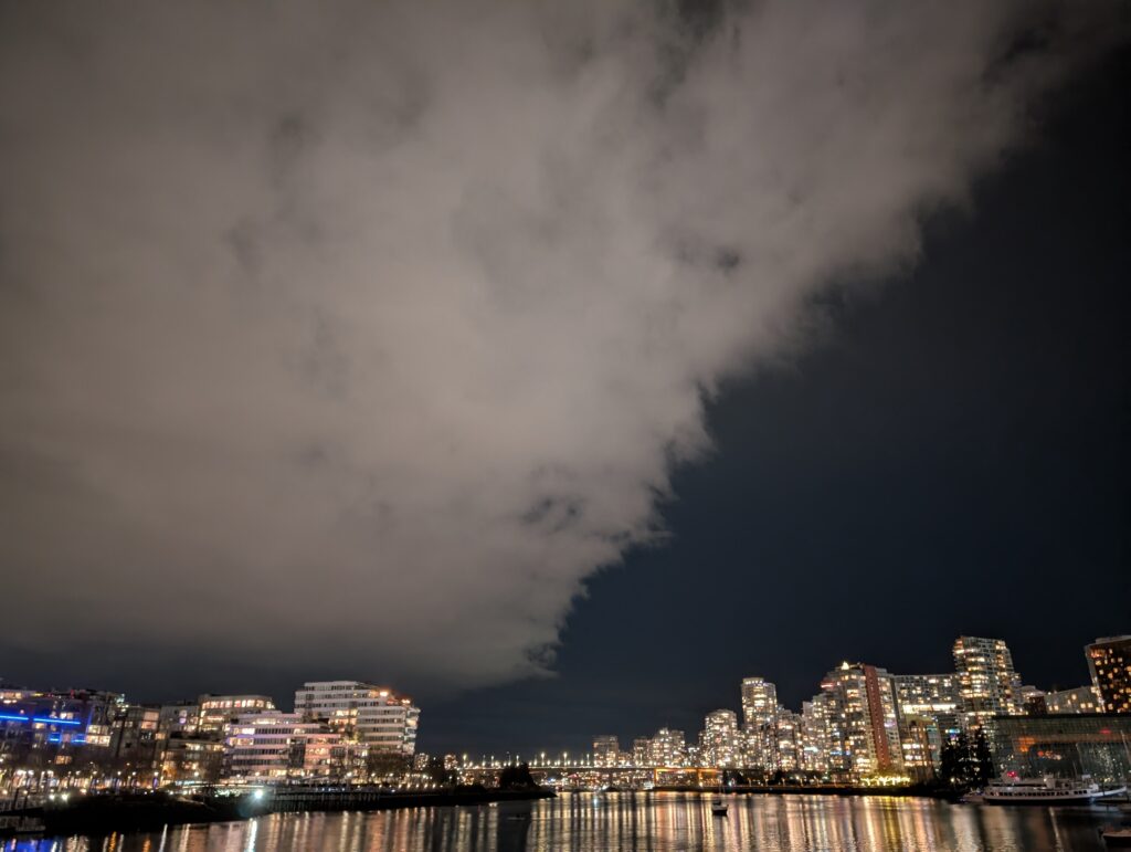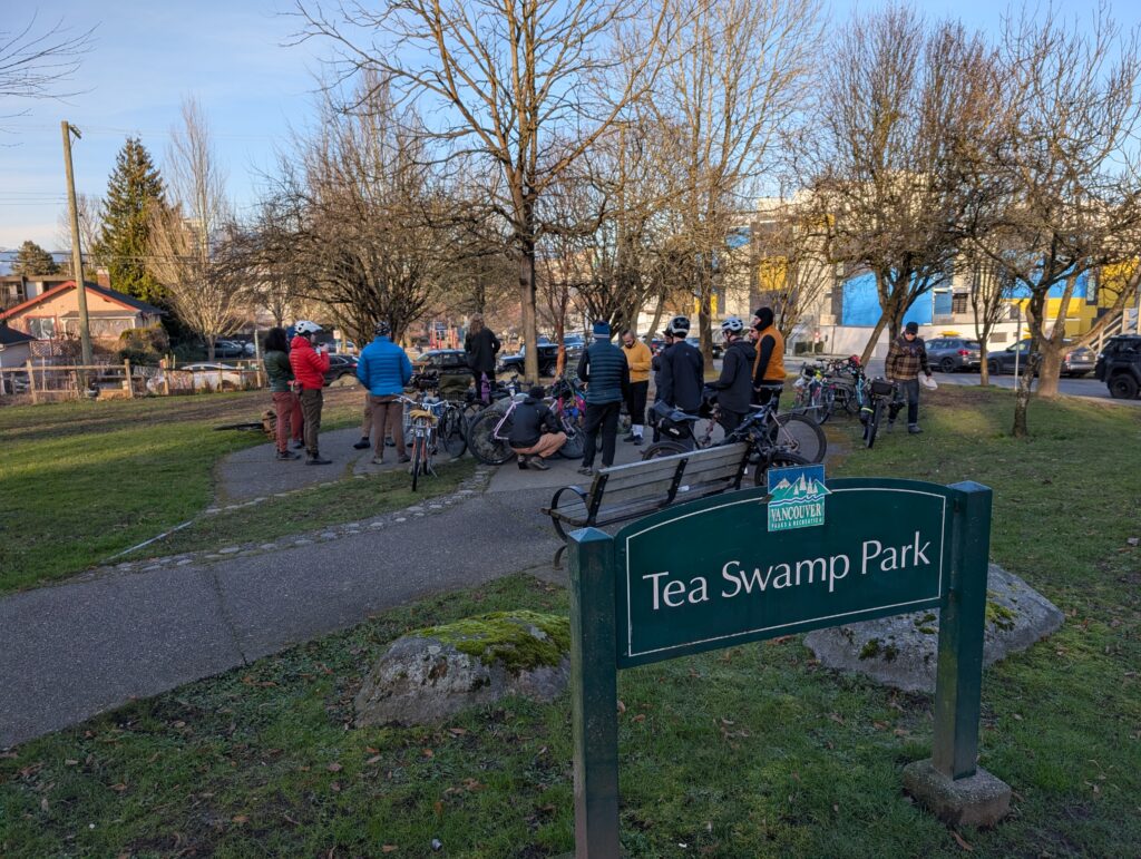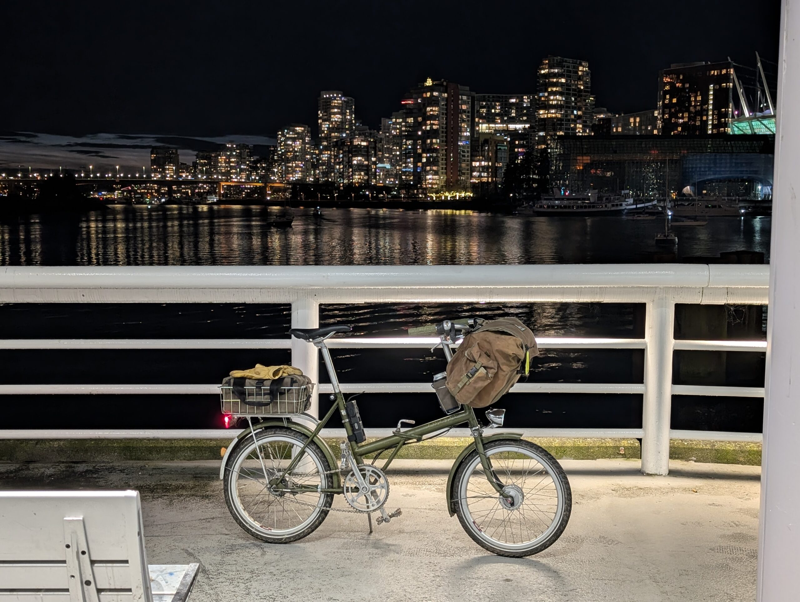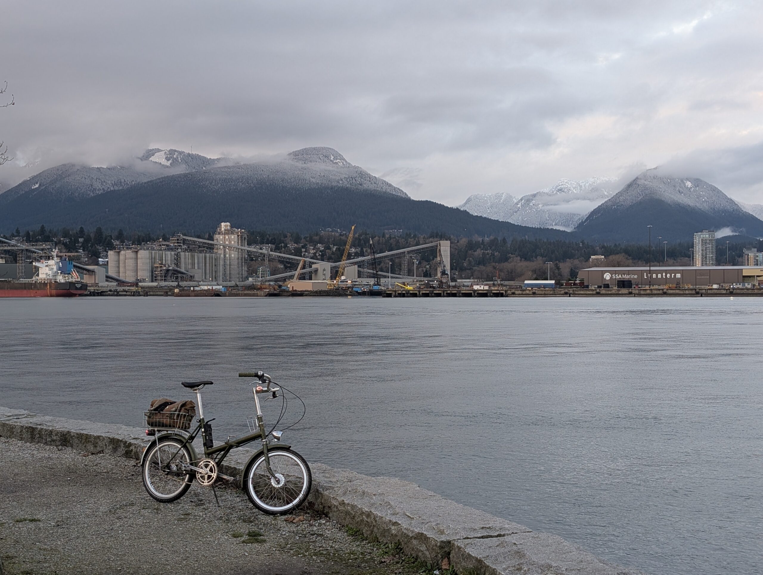On the 17th, a Friday, I left home for the downtown waterfront to meet up with Rob for a cold one in the cold air. The days are inching longer, not entirely dark when I get off work at 5pm now, but the light was all but gone by the time I made it into town. We rode into Stanley Park and followed some gravel paths before working eastwards towards my neighbourhood.