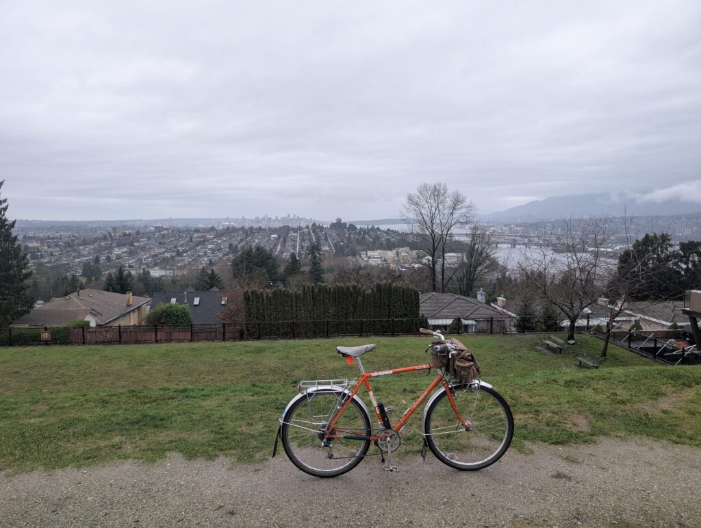 Rob and I got out after work once again for a very chilly ride up to QE Park, one of the best lookouts in Vancouver proper. It was getting cold enough by the end of the evening that black ice could be a concern, and over the next week just about every night was foggy and below freezing, leading to very slick mornings. I know a few people who bike-commuted and crashed on the ice; I opted to avoid riding to work until temps were comfortably above freezing.