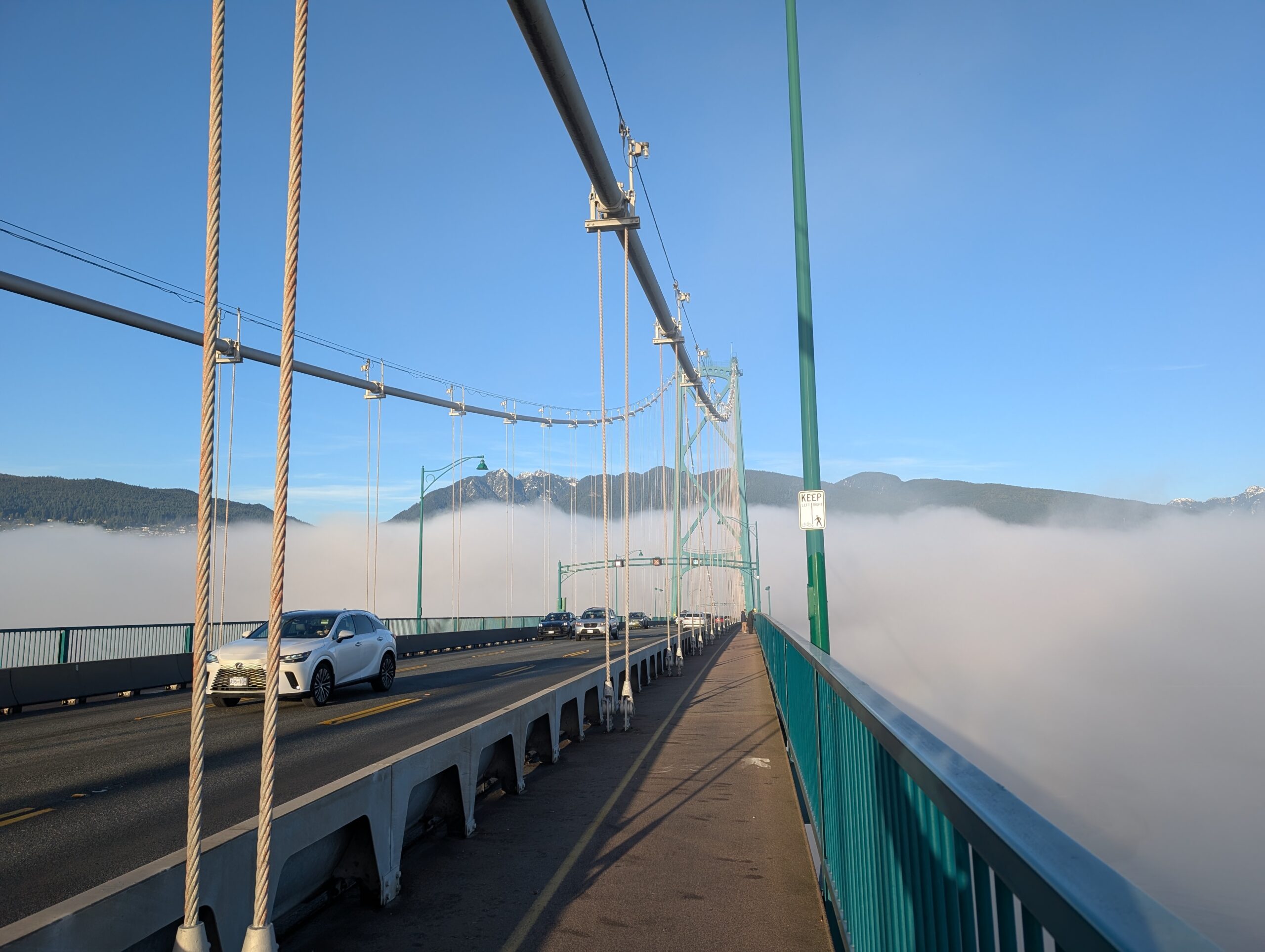 When I did finally reach the bridge, I was treated to the scene below, with a clump of fog holding onto the bridge but with clear air above me. Pretty neat!