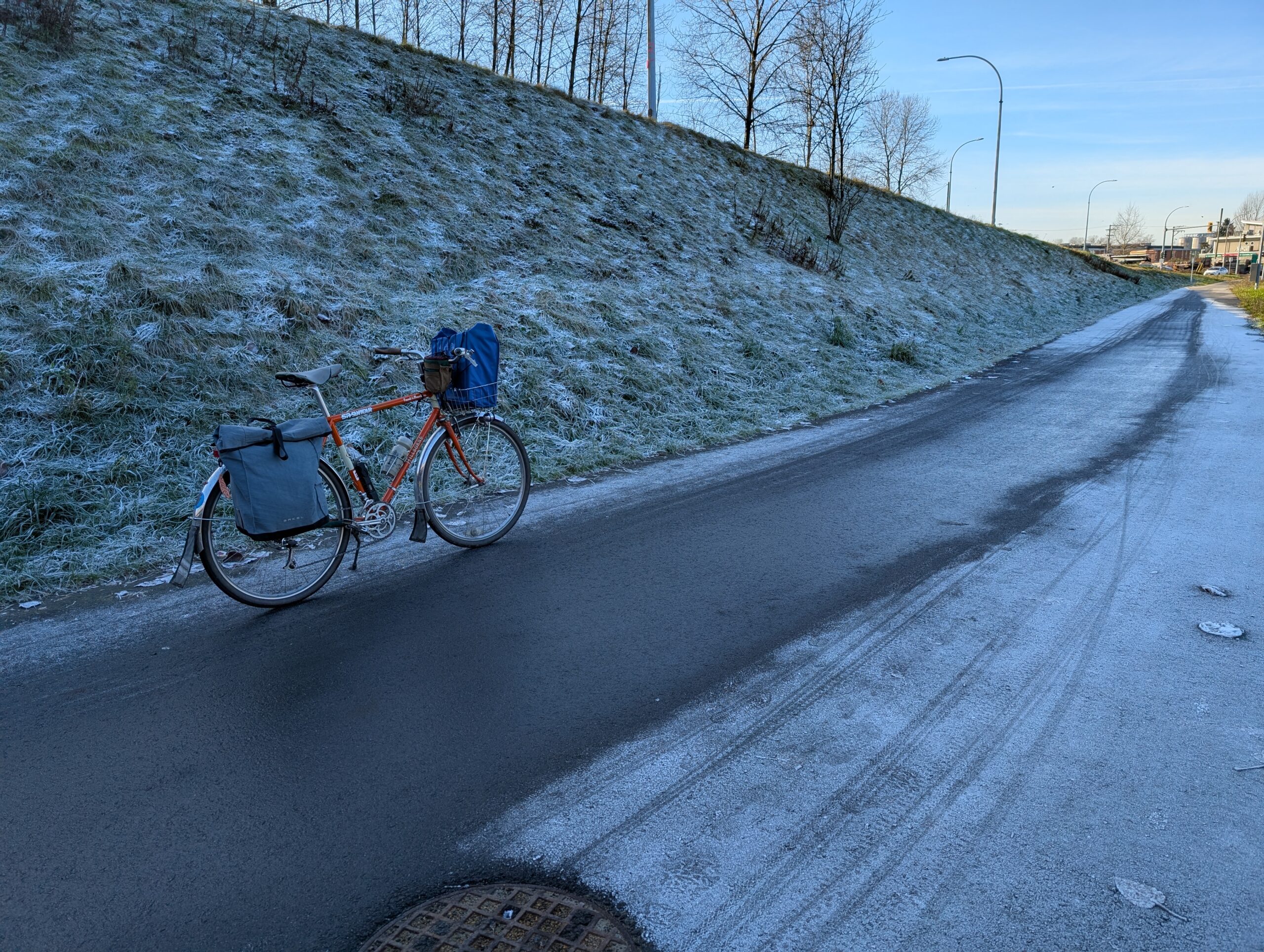 On the 25th we had Parkbagging again, and this time I did a two-bridge loop before ‘bagging instead of after because I had to run a Lynn Valley errand. I left shortly before noon and the frost was still thick in shady areas.