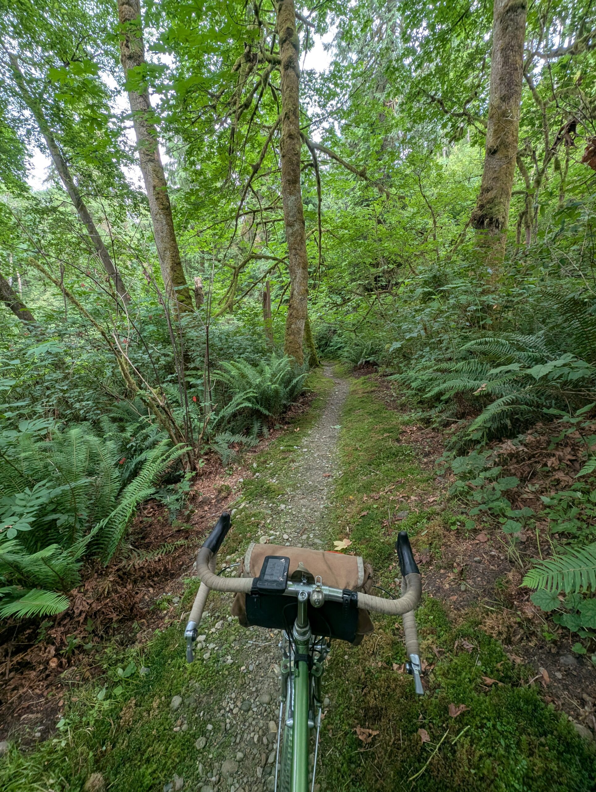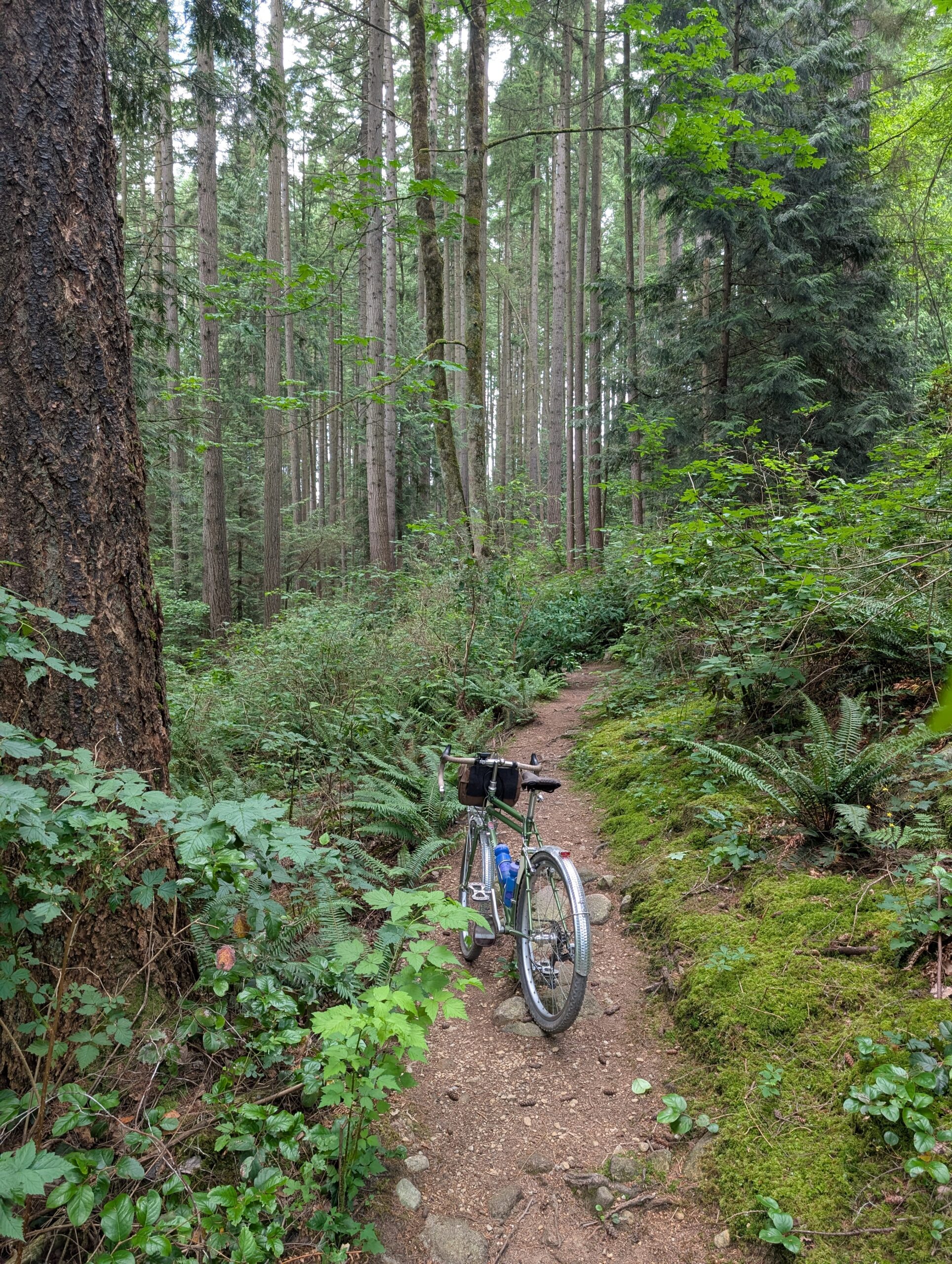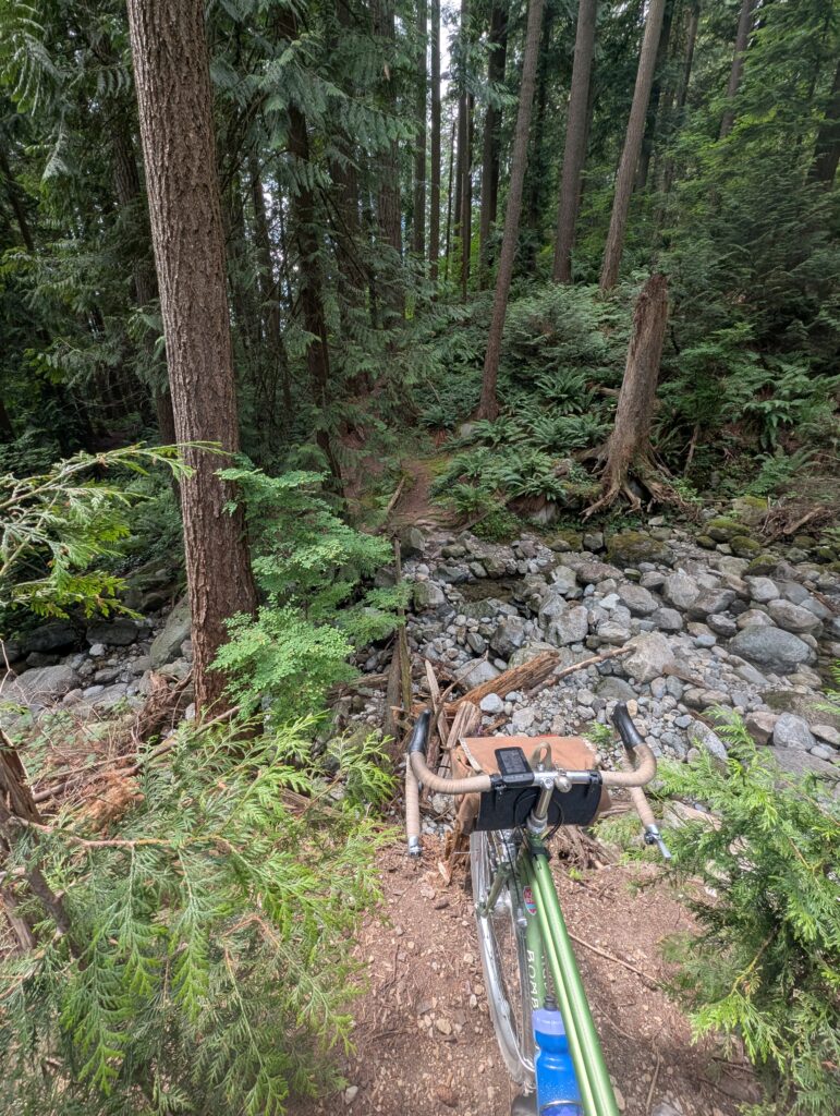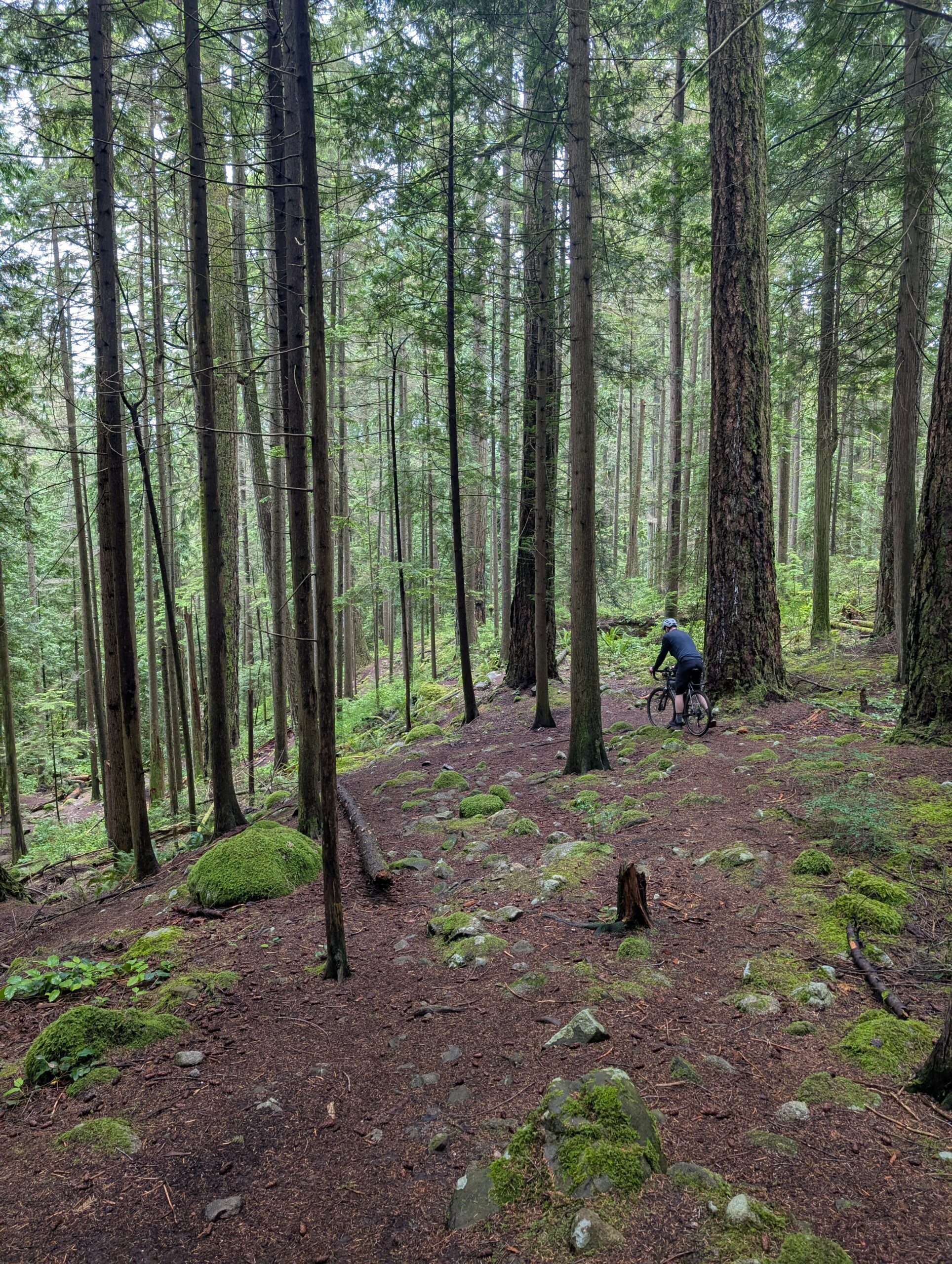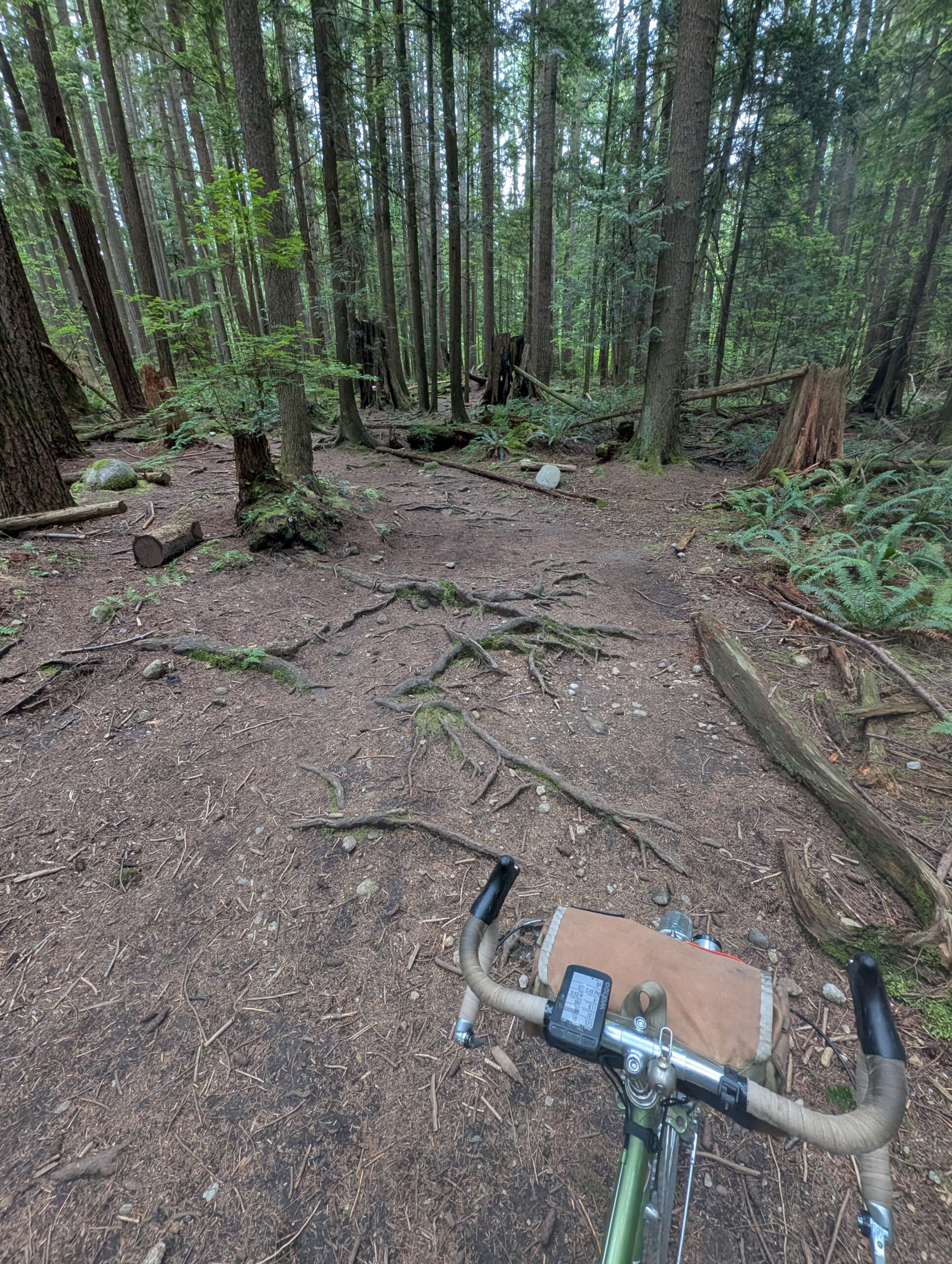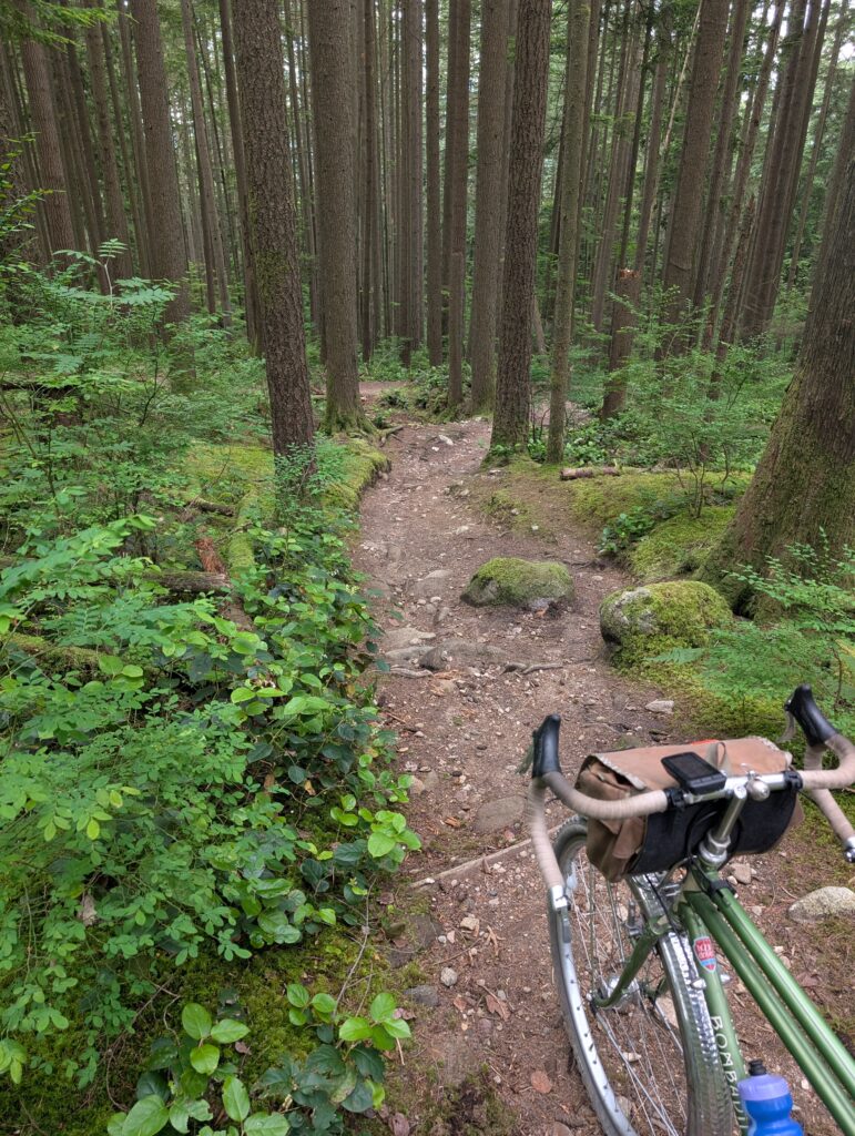 I was in what’s called the Bert Flinn trail network, which is a mix of green and blue MTB trails. Quite gravel-bike friendly compared to most local MTB trails, these weren’t too steep and only modestly technical. Most of the wood features were older, many rotted away. As I hope the photos convey, it’s really lovely in here. I went back with Rob in November, aboard the newly built Evasion which I had literally this route in mind when I built.