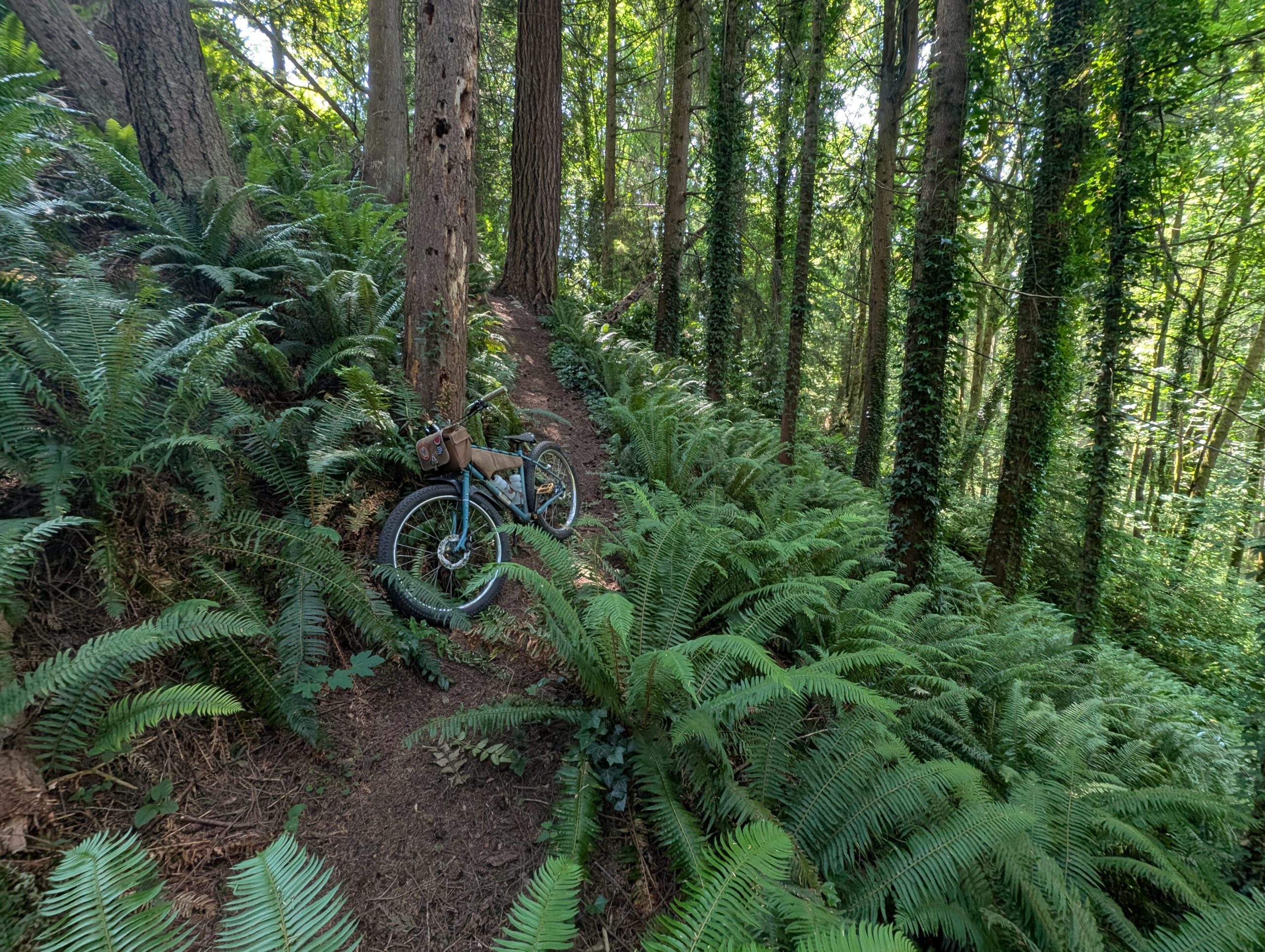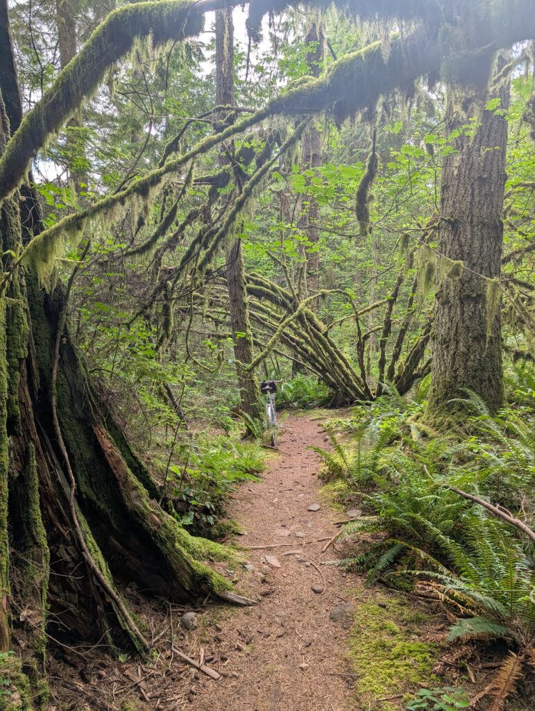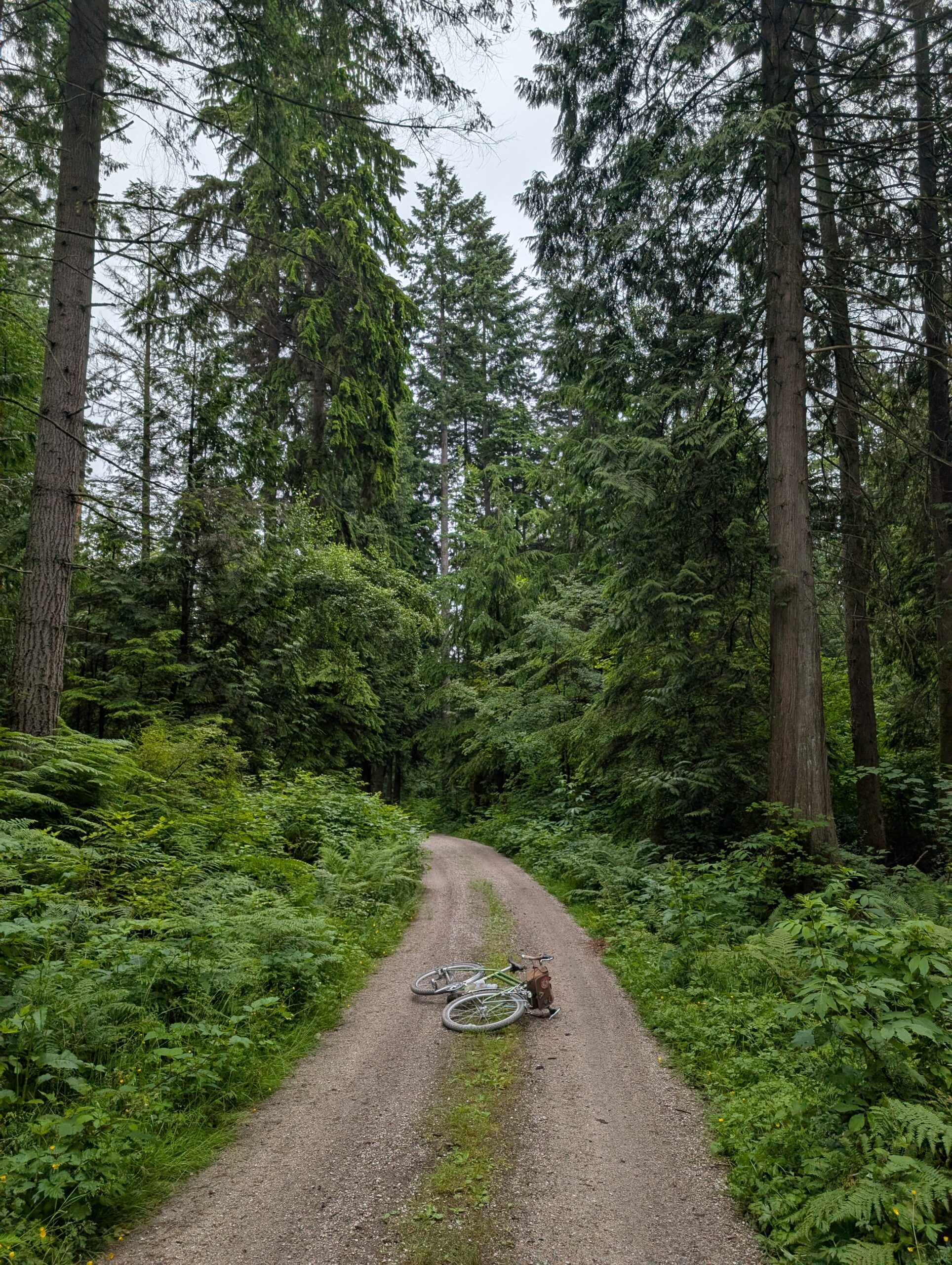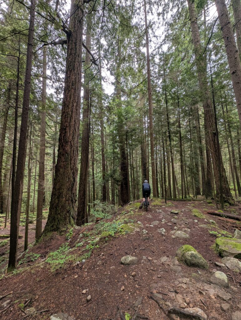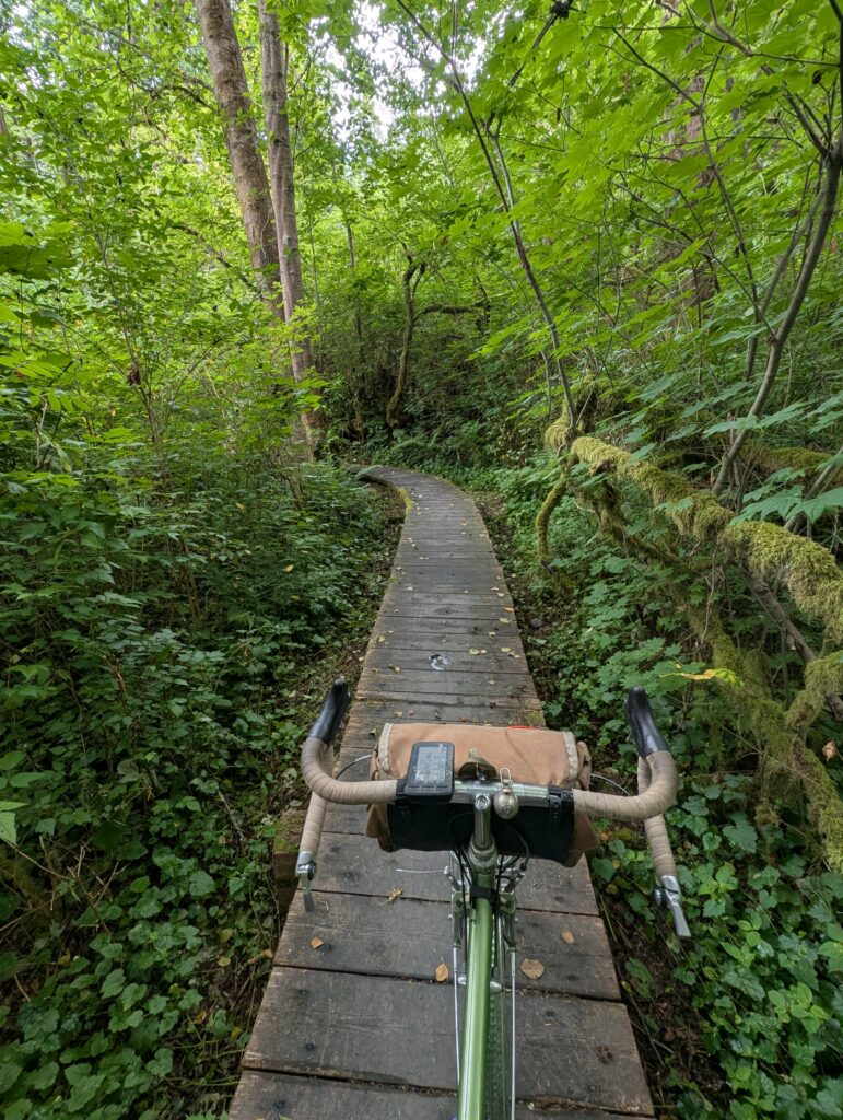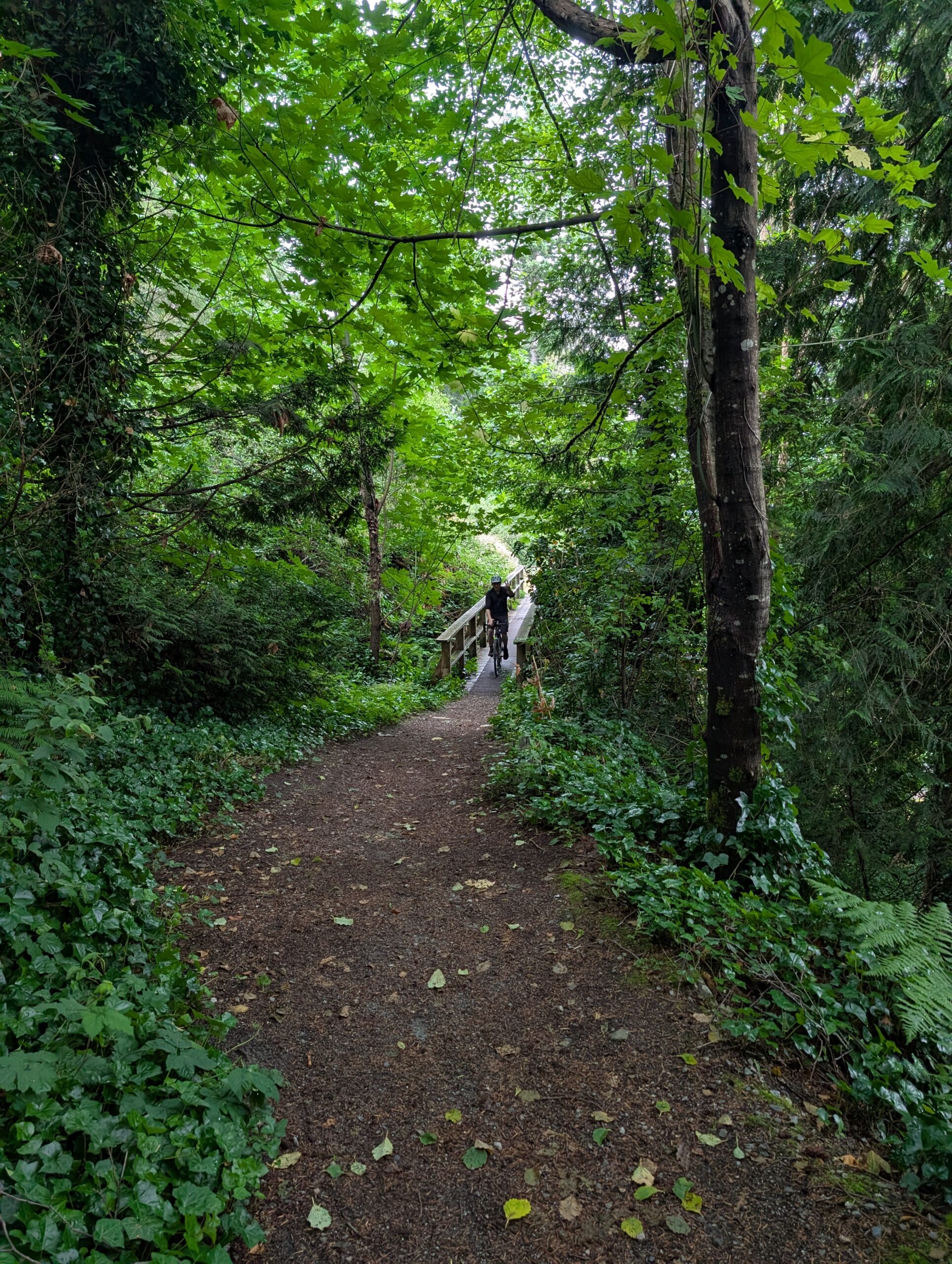 I was in what’s called the Bert Flinn trail network, which is a mix of green and blue MTB trails. Quite gravel-bike friendly compared to most local MTB trails, these weren’t too steep and only modestly technical. Most of the wood features were older, many rotted away. As I hope the photos convey, it’s really lovely in here. I went back with Rob in November, aboard the newly built Evasion which I had literally this route in mind when I built.