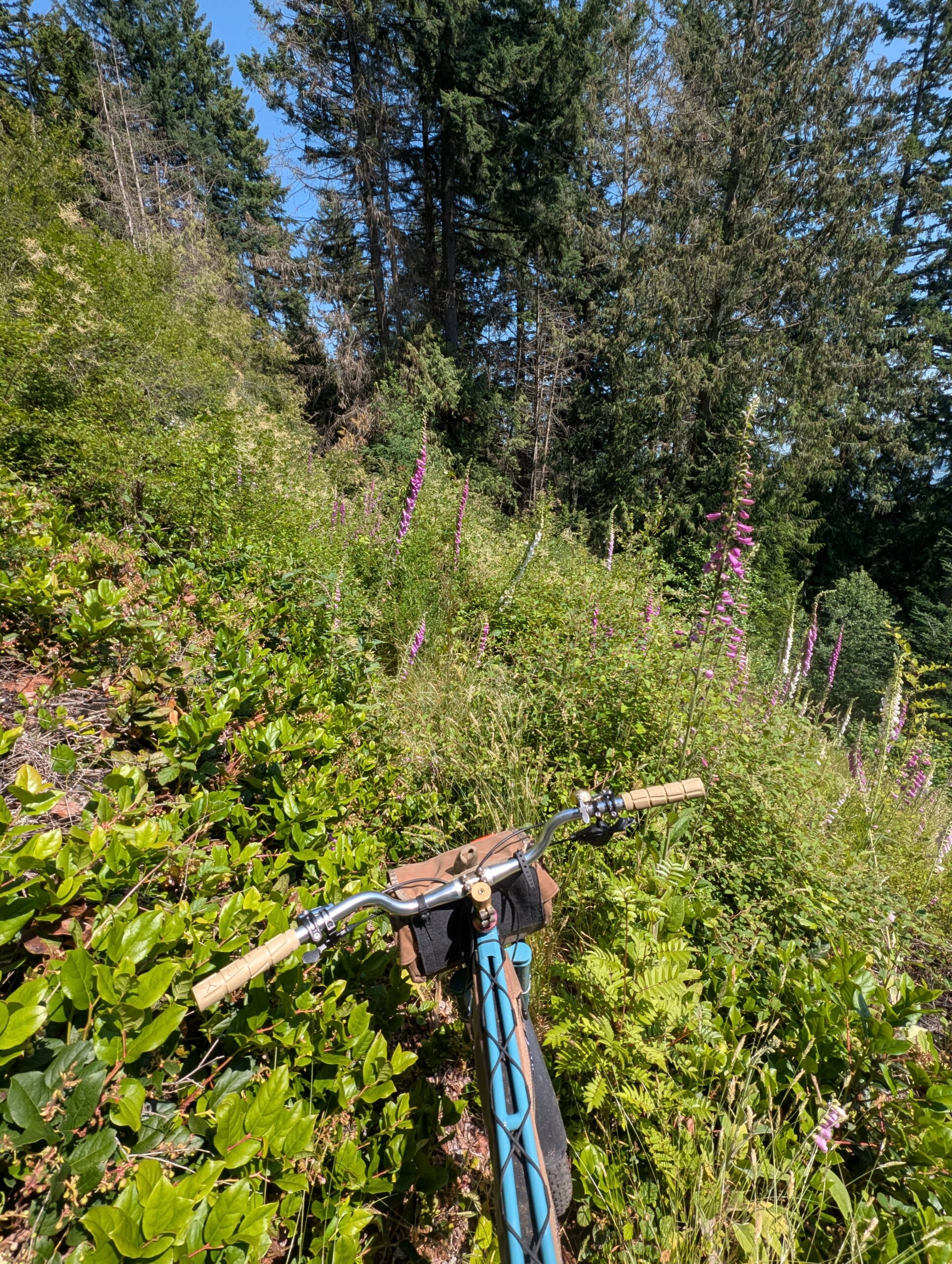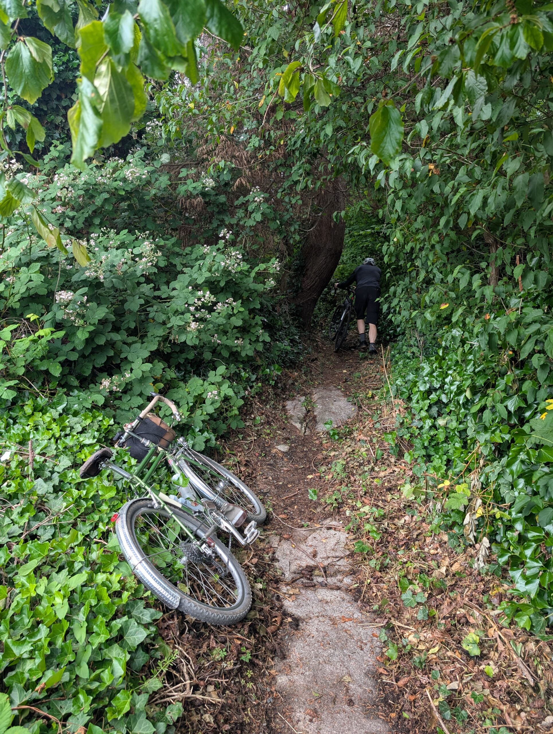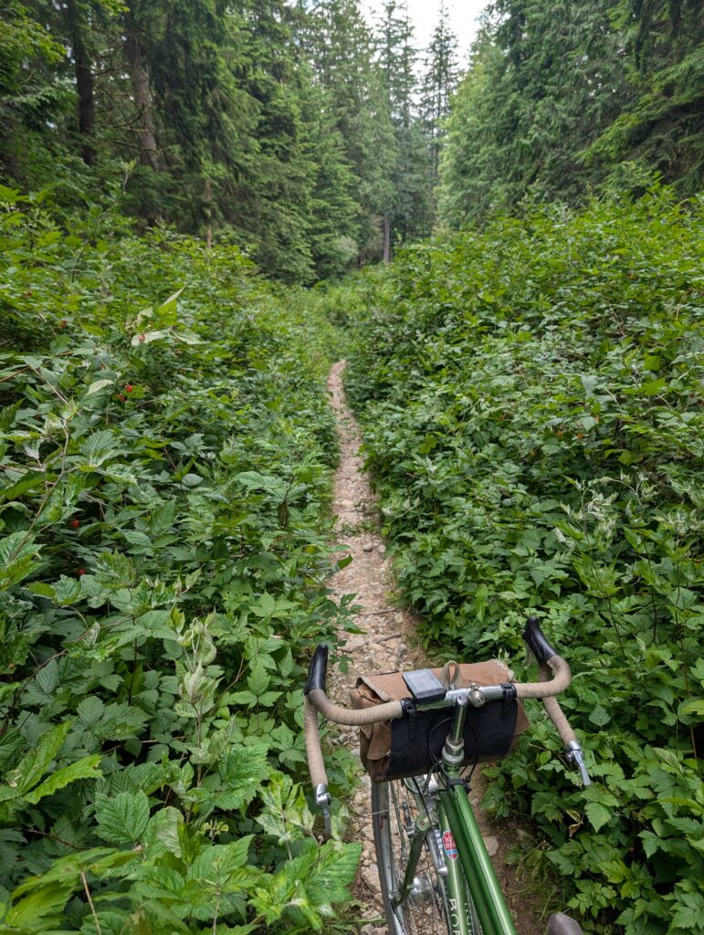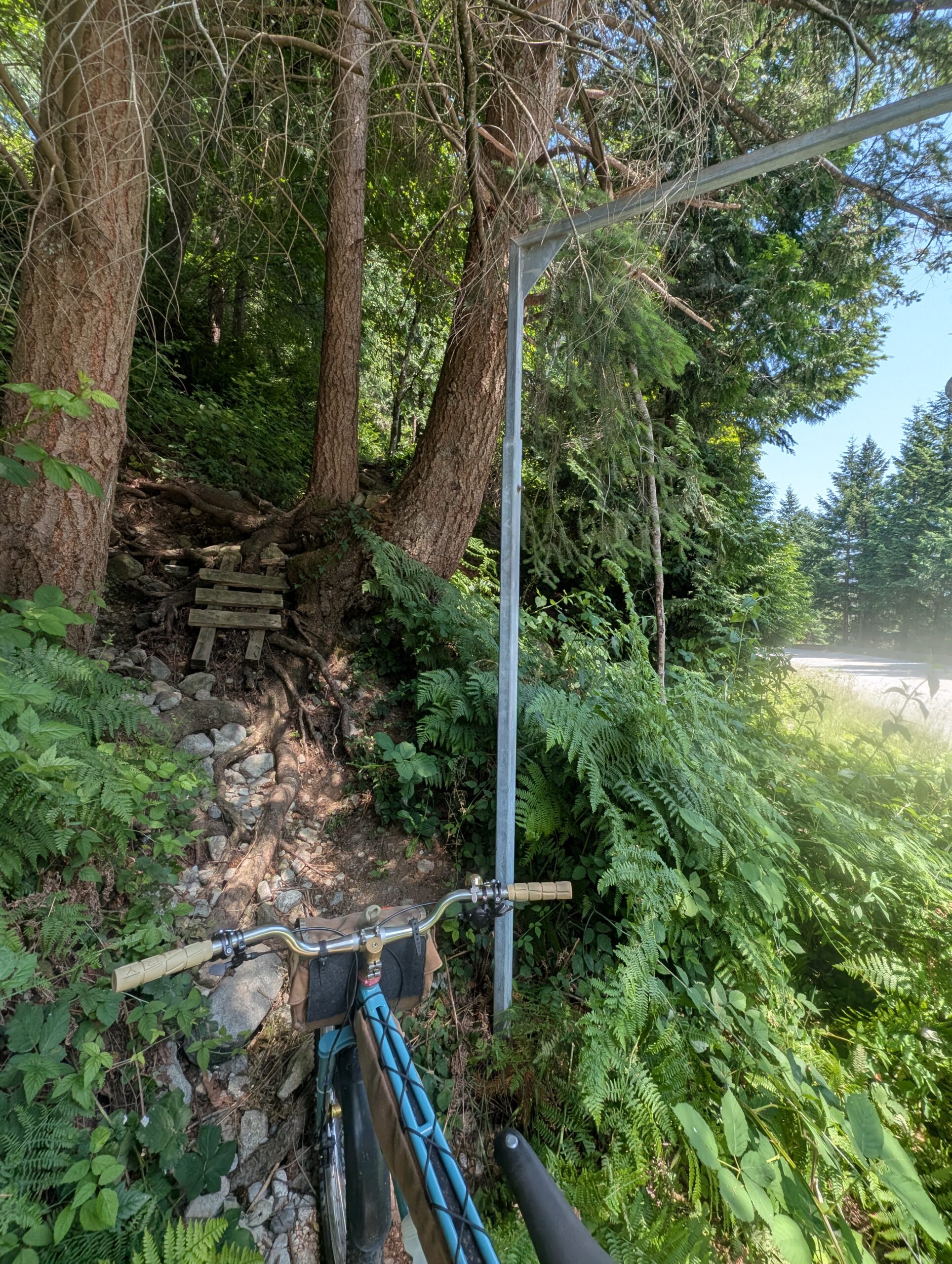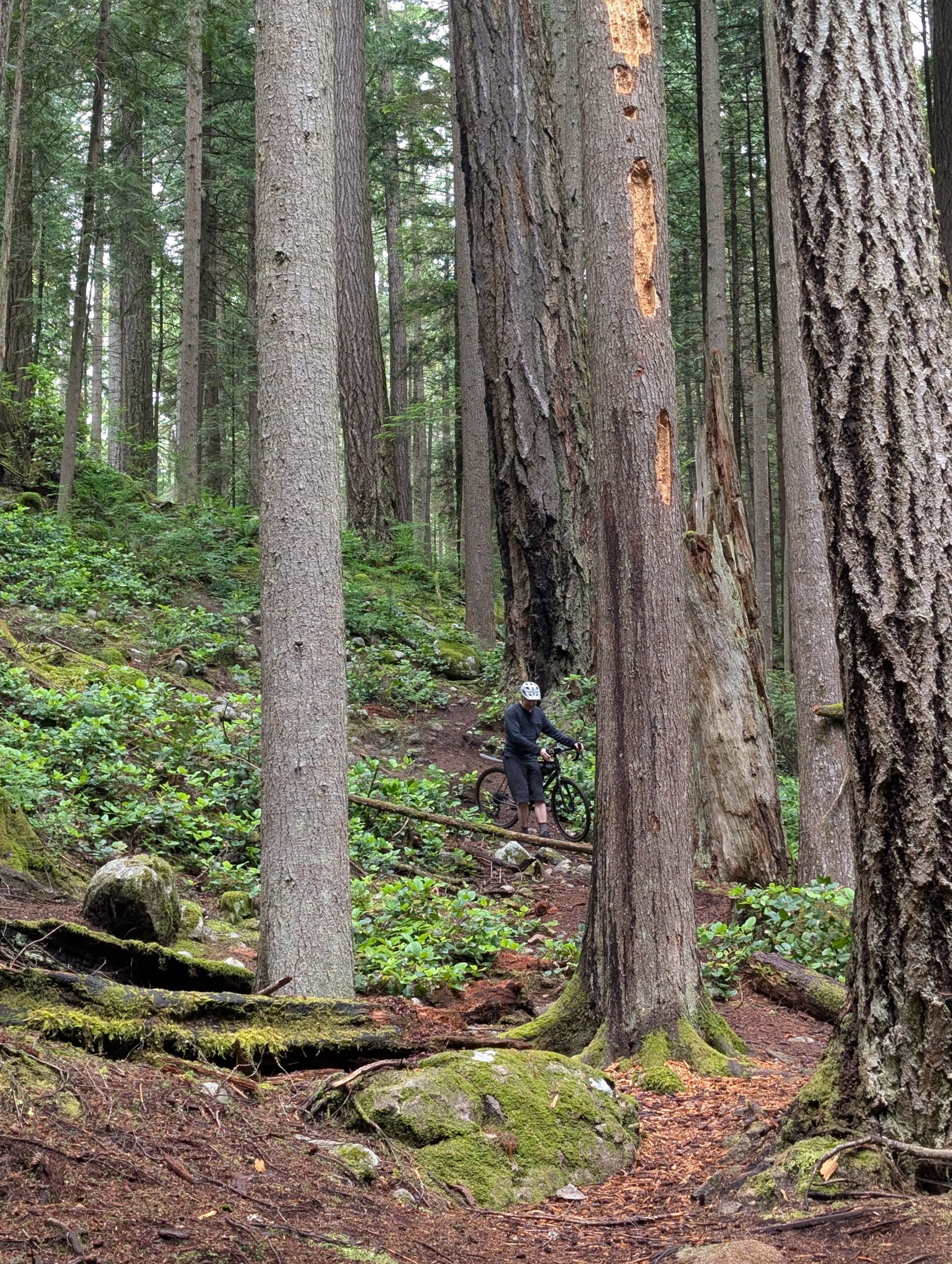 I was in what’s called the Bert Flinn trail network, which is a mix of green and blue MTB trails. Quite gravel-bike friendly compared to most local MTB trails, these weren’t too steep and only modestly technical. Most of the wood features were older, many rotted away. As I hope the photos convey, it’s really lovely in here. I went back with Rob in November, aboard the newly built Evasion which I had literally this route in mind when I built.
