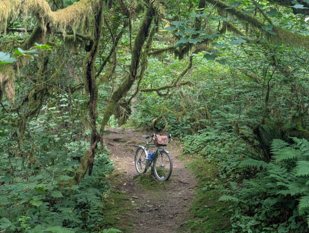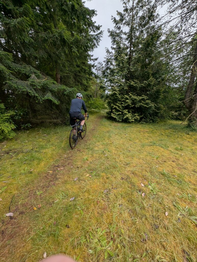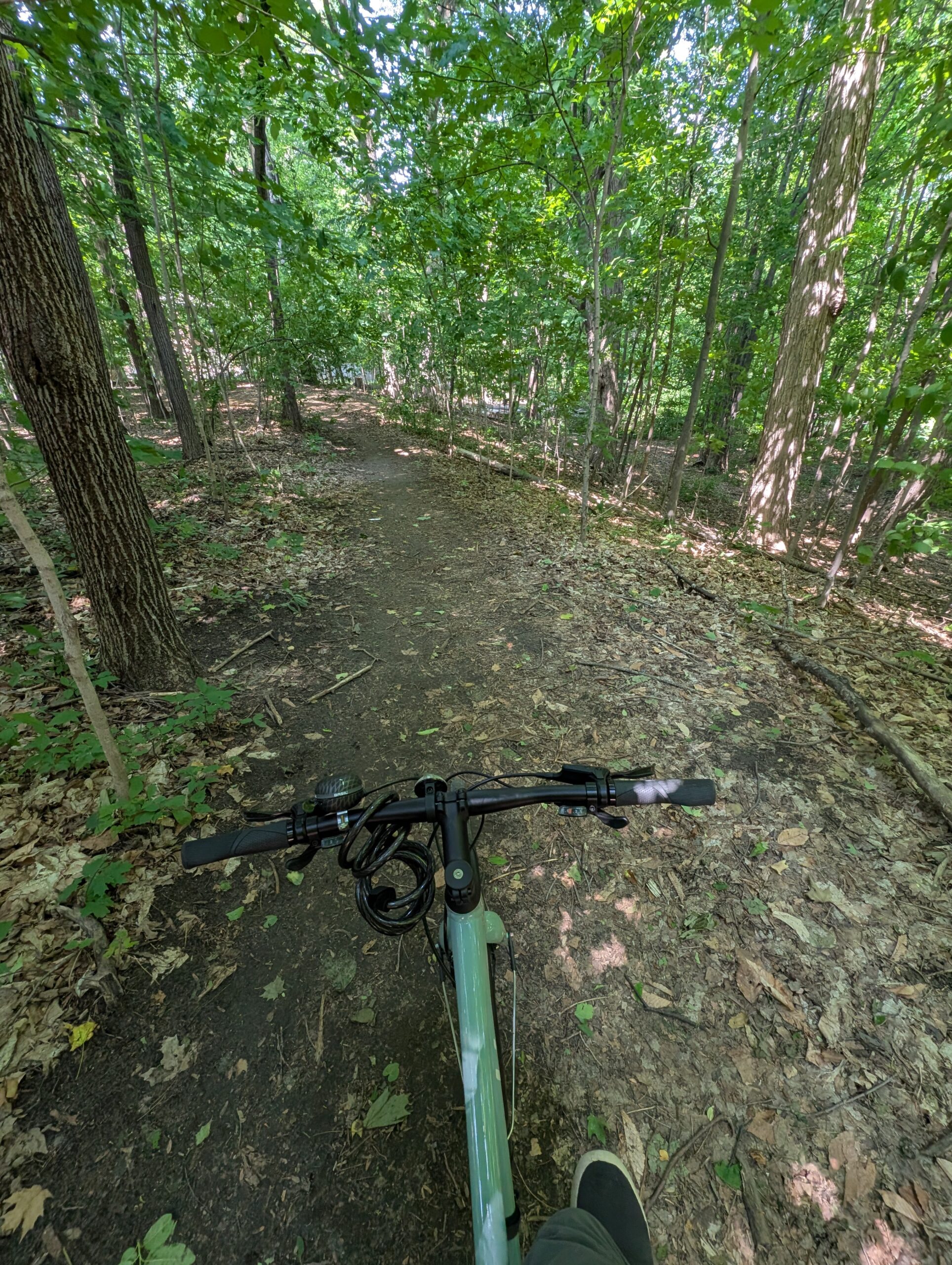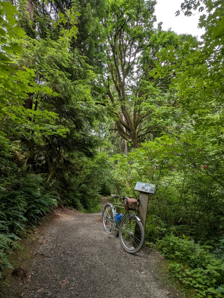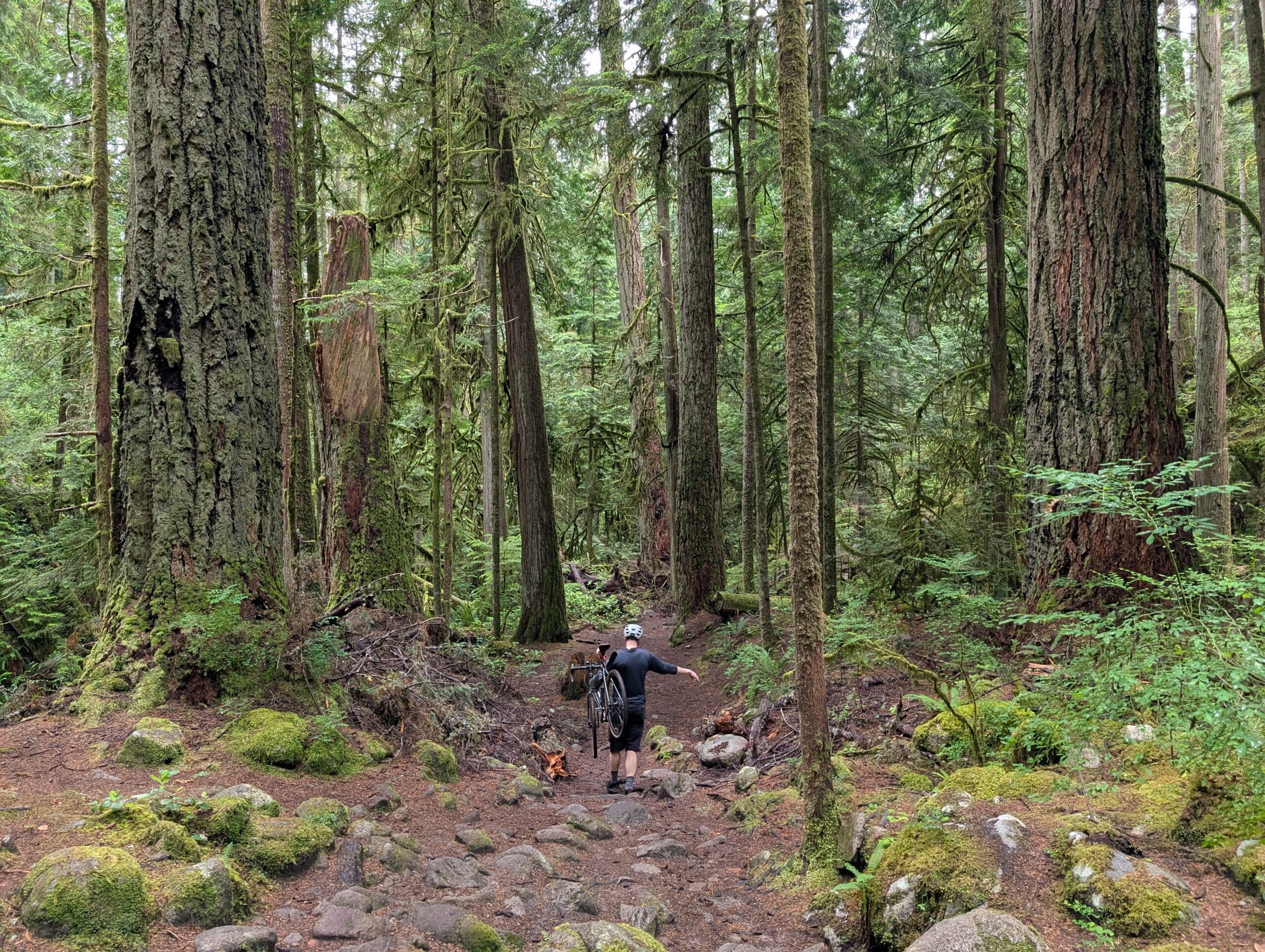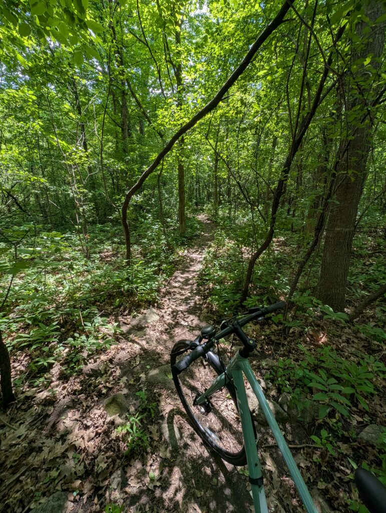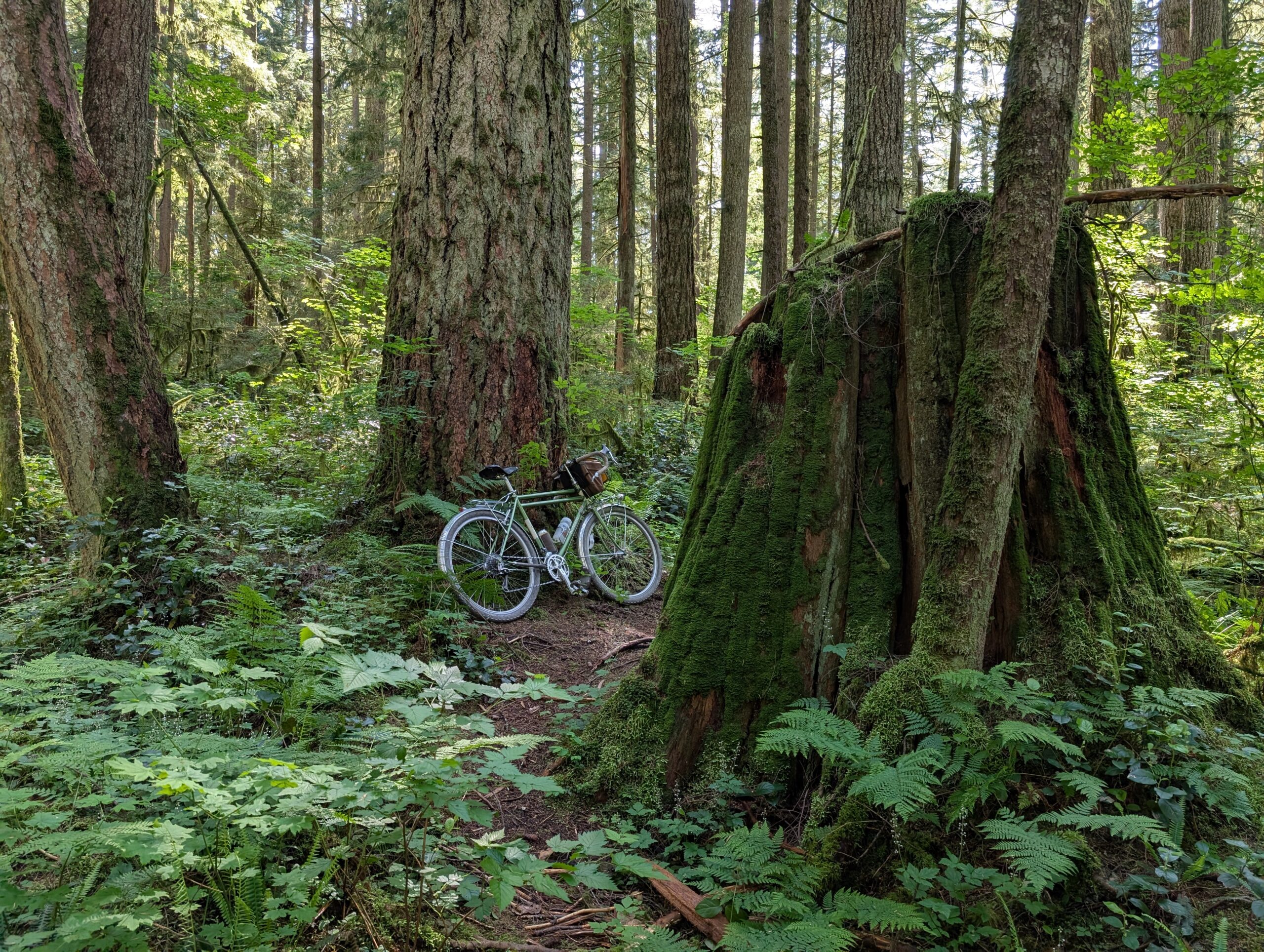 I was in what’s called the Bert Flinn trail network, which is a mix of green and blue MTB trails. Quite gravel-bike friendly compared to most local MTB trails, these weren’t too steep and only modestly technical. Most of the wood features were older, many rotted away. As I hope the photos convey, it’s really lovely in here. I went back with Rob in November, aboard the newly built Evasion which I had literally this route in mind when I built.