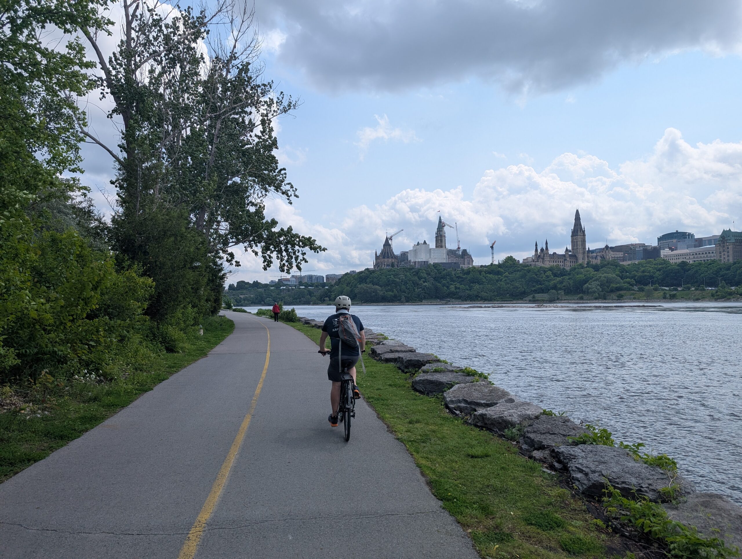 My first bike ride in Ottawa was Tuesday, late morning, with my brother-in-law acting as a tour guide. I was amazed by the network of bike paths that were fully separated from the roads. We crossed a bikes/pedestrian-only bridge into Quebec, just the other side of the river, and followed a seaside path eastwards for a few kilometres. We then crossed back over to Ottawa on a mixed use bridge that also had a very wide, lovely bike and pedestrian lane. This brought us to downtown Ottawa and around the Parliament buildings. Thankfully I had my tour guide Joel who pointed out various notable buildings such as the Supreme Court.