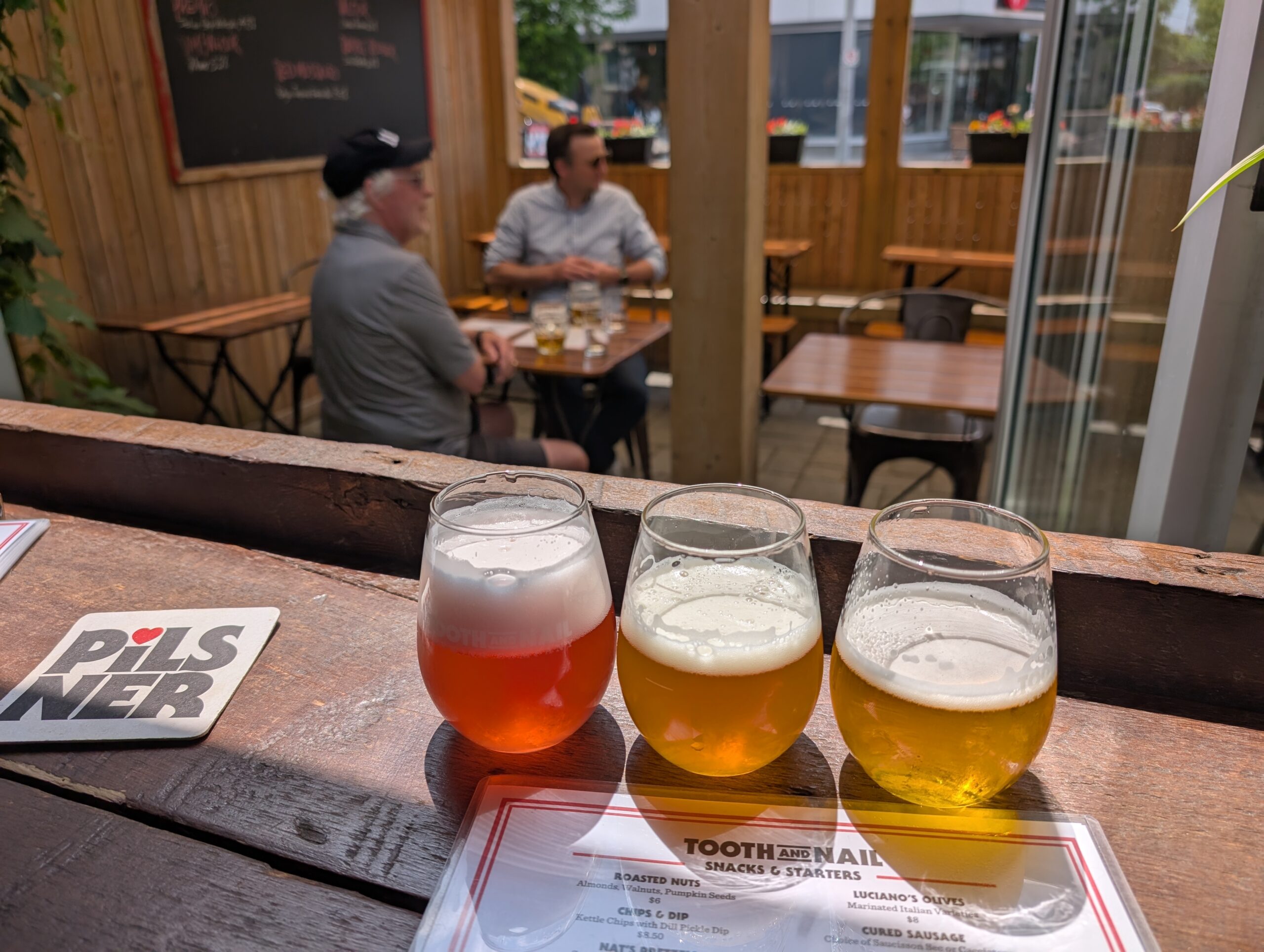 From there I decided to try for one of the breweries my beer-nerd friends recommended, and the one within reach was Tooth and Nail. I got a flight of three Belgian-inspired beers and they were excellent. By the time I had ridden back to our neighbourhood, it was a little over 31km – and a measly 164m of elevation, almost entirely from Gatineau Park. Pretty flat out here!