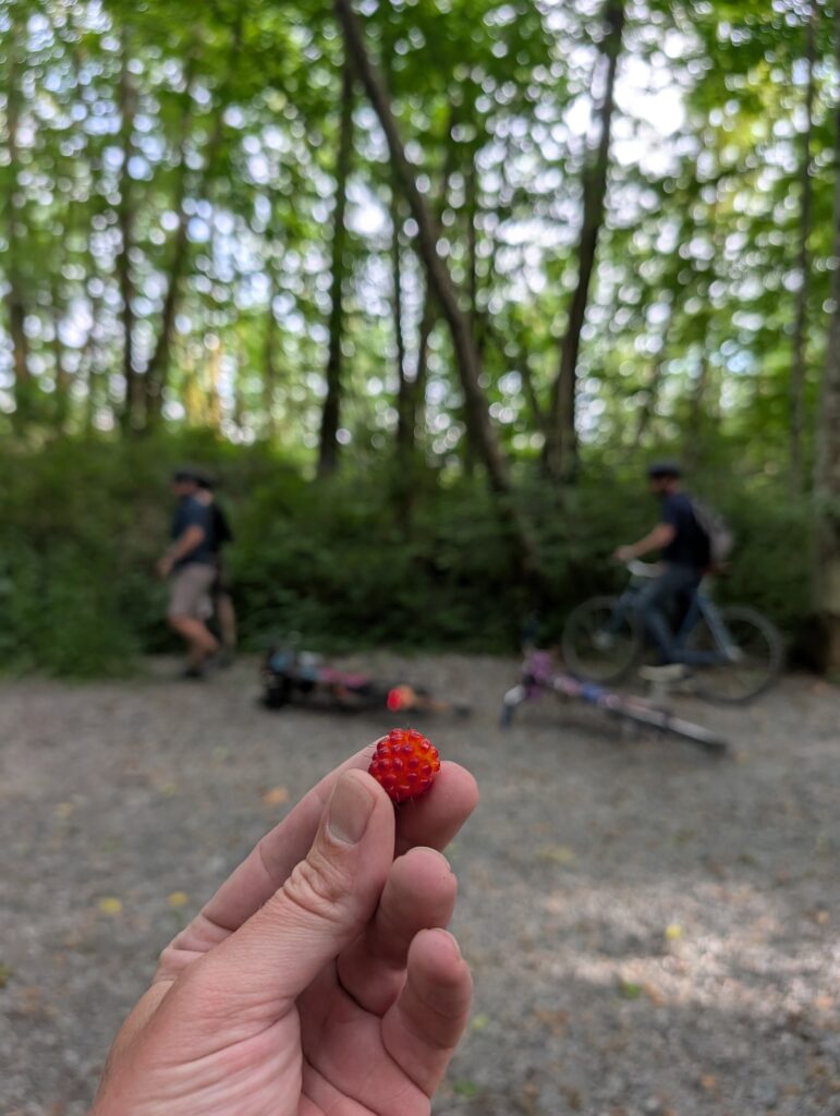 Then the following weekend, now the 28th of June, I went for a bike ride I had in mind for a while: Port Moody, to see about the trails near Buntzen Lake. I wasn’t feeling particularly well but managed to convince myself of the rather ambitious route anyway. Heck, I even took the difficult side trails instead of just riding Barnet Highway. But I mean, look at those first handful of foresty photos – it’s beautiful in there. I also found some ripe thimbleberries along Barnet Trail.