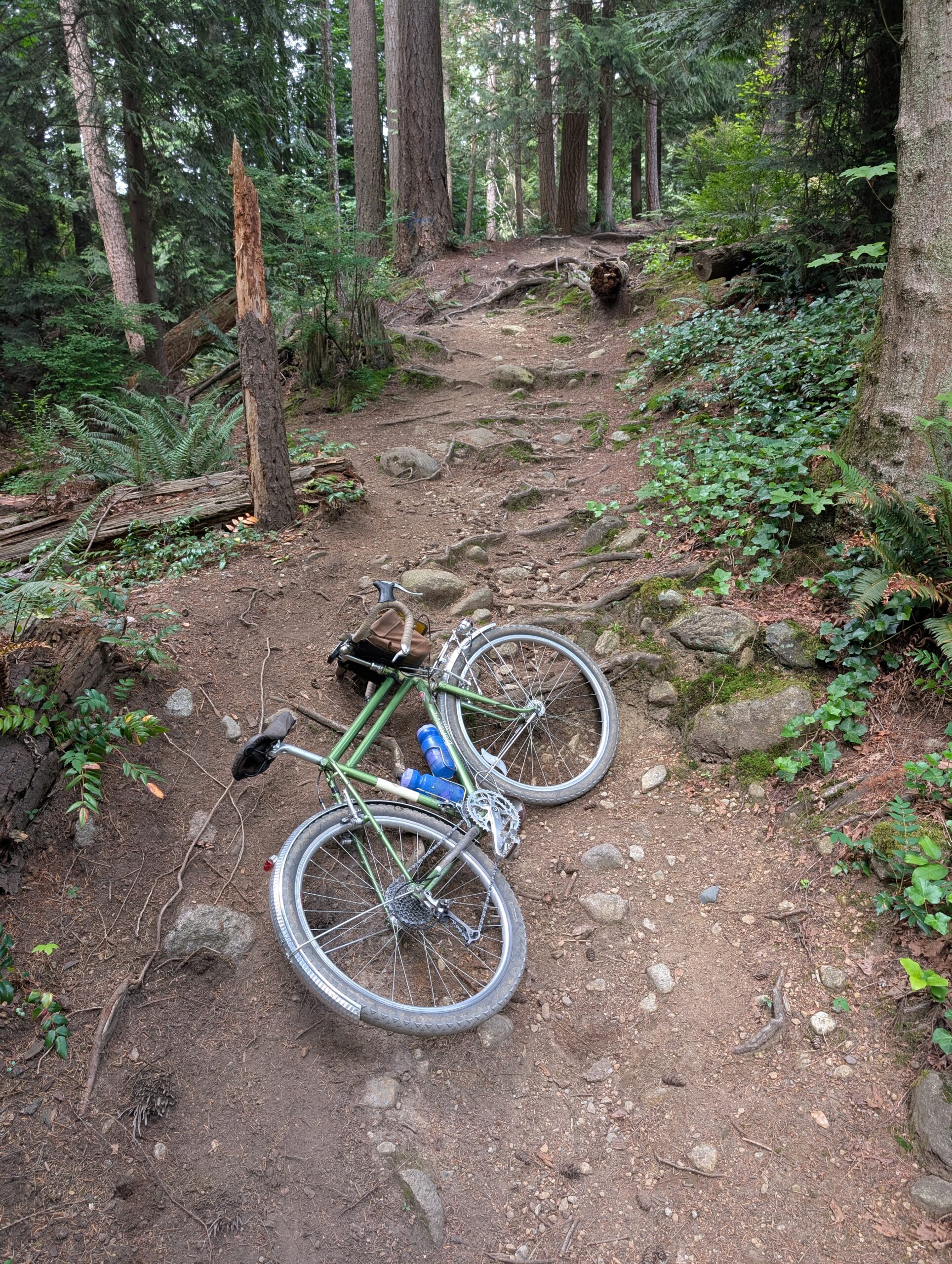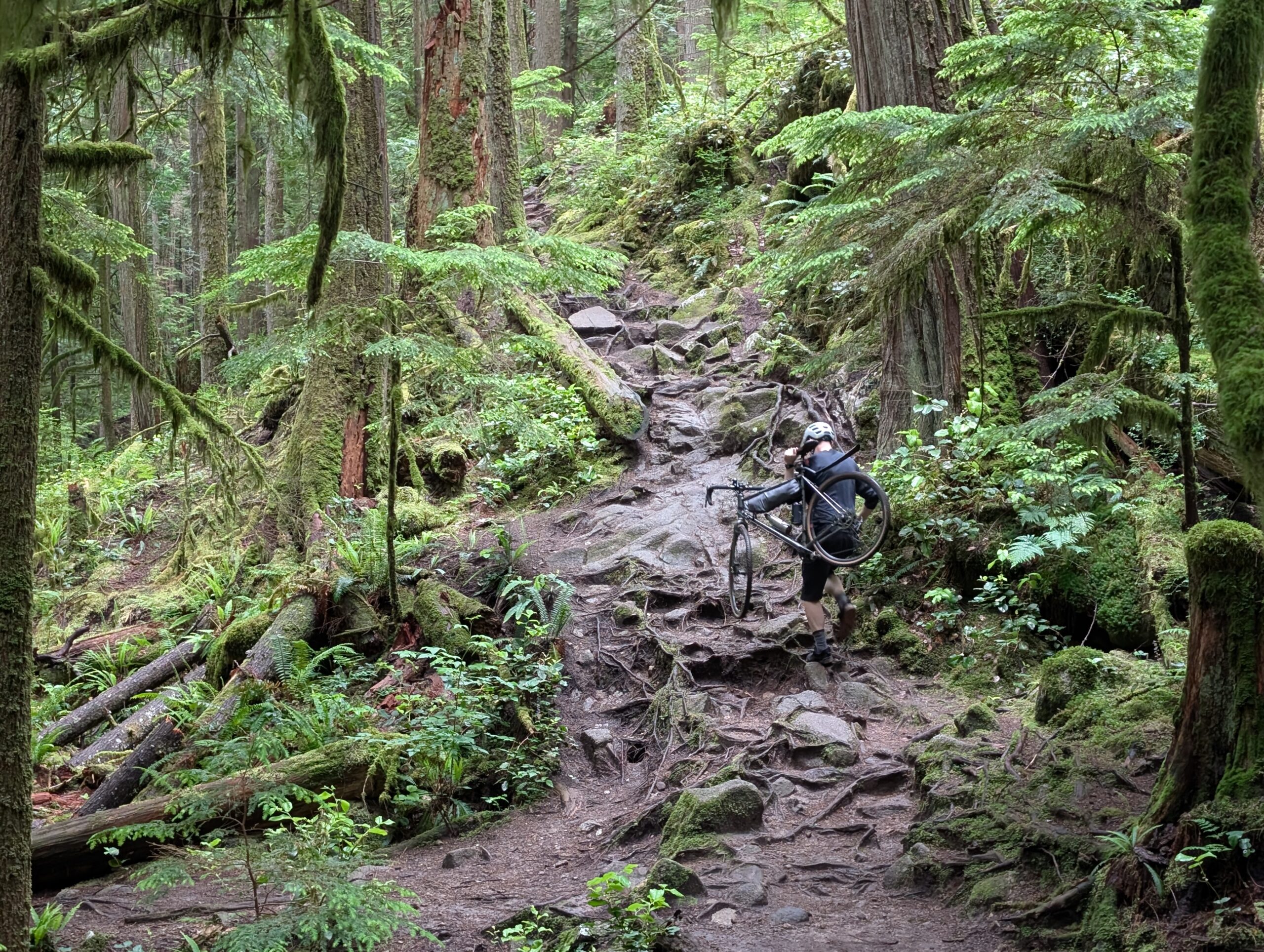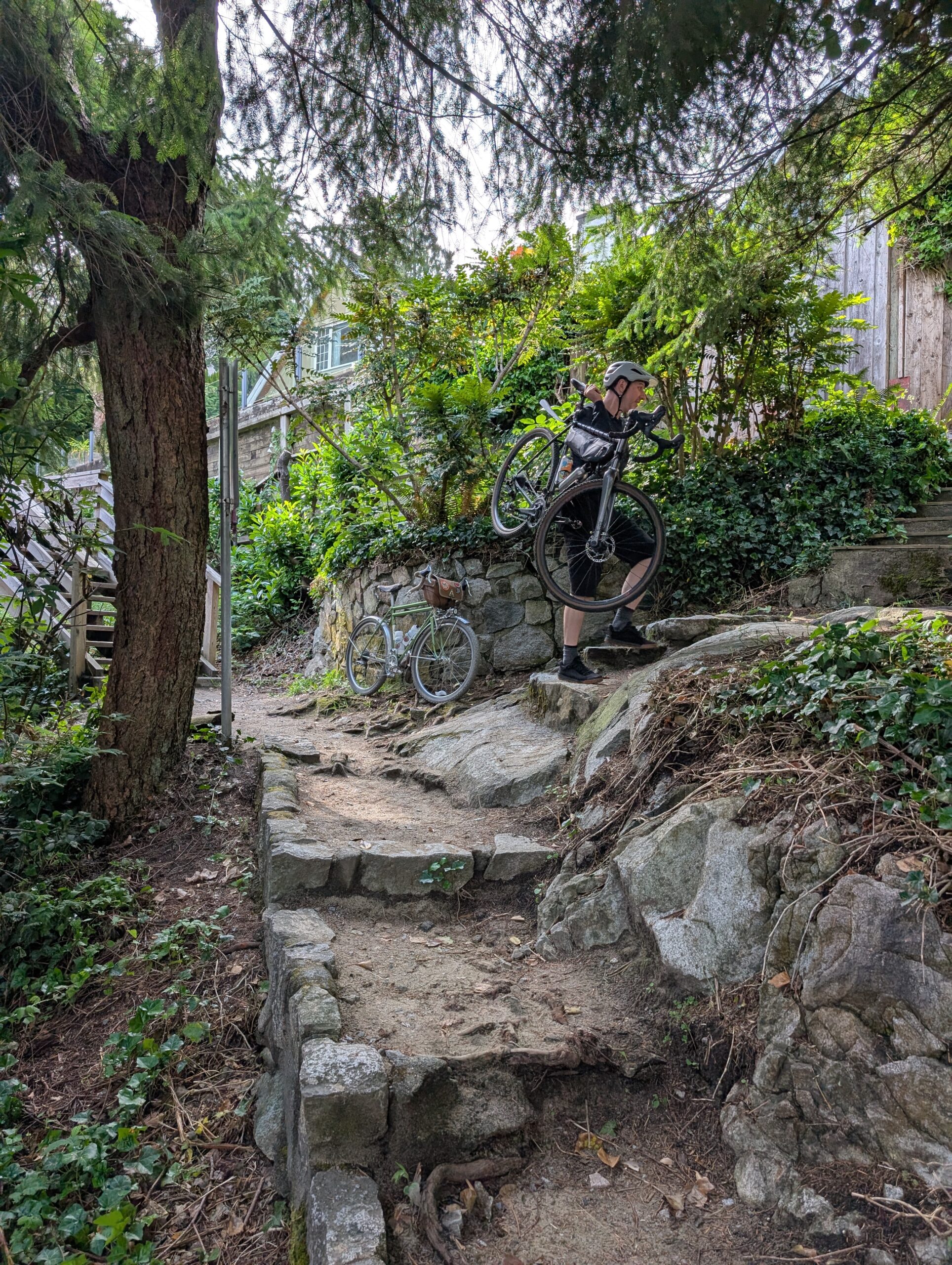 I guess I was still itching to ride my own bikes though, because even though we got home nearly midnight on Saturday, I was out on the Stooge by mid-morning Sunday – and got over 60km in on the big bike. I rode / bushwhacked some trails on Seymour, then worked my way all the way west to Cypress where again I bushwhacked – this time less successfully. I should have probably known when I had to hoist my bike up a literal ladder to get into the trail.