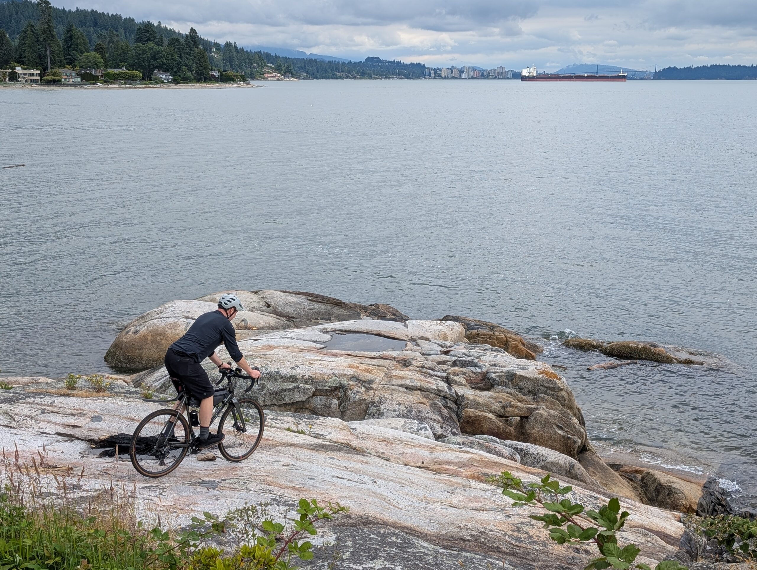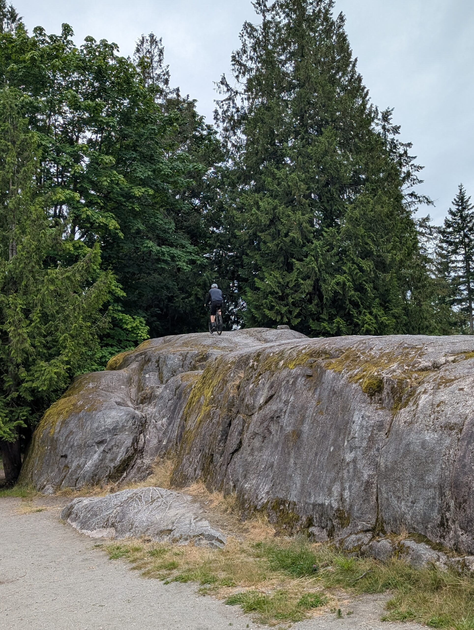 We started descending towards the water and found a tunnel that I’d passed by countless times on my way to the ferry and never noticed! It led us to a school ground with fun rock, and then we ended up on connector trails that were much better than either of us expected. Finally we reached Caulfield Park, a gem of a spot right by the much more well-known Lighthouse Park. The ocean-front riding is really fun, though not always rideable. We also spent a good deal of time just lounging on the rocks like lizards.